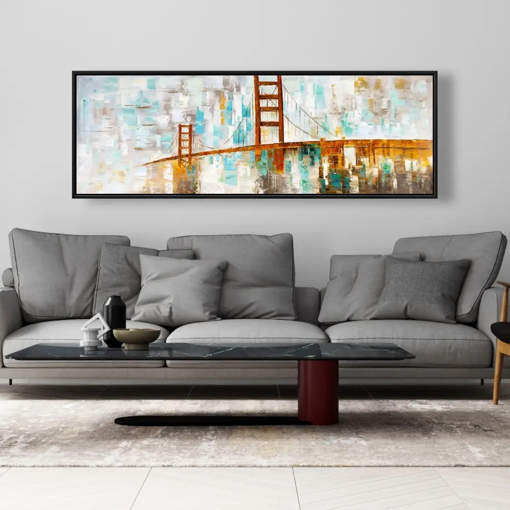 Golden gate with turquoise paint spots is a stunning framed canvas that adds a touch of modern elegance to your living room decor. This captivating artwork features a vibrant golden gate adorned with unique turquoise paint splashes, creating a striking contrast that draws the eye. Perfect for contemporary interiors, this piece effortlessly enhances your home's aesthetic, making it a focal point in any space. Crafted with high-quality materials, it offers durability and a refined finish that elevates your decor. Whether you're redesigning your living room or looking for the perfect statement piece, this canvas brings warmth and character to your home. Ideal for art lovers and interior design enthusiasts alike, the golden gate with turquoise paint spots is not just a decoration; it's an expression of style and creativity. Transform your living area into a sophisticated haven with this beautiful artwork, and enjoy the compliments from guests. Shop now to bring this unique canvas into your home and create an inviting atmosphere that reflects your personal taste. Features Golden Gate with Turquoise Paint Spots - Modern Framed Canvas. Ready to hang. Real canvas. Specifications Size: 20" x 60". Weight: 11.43 lbs.