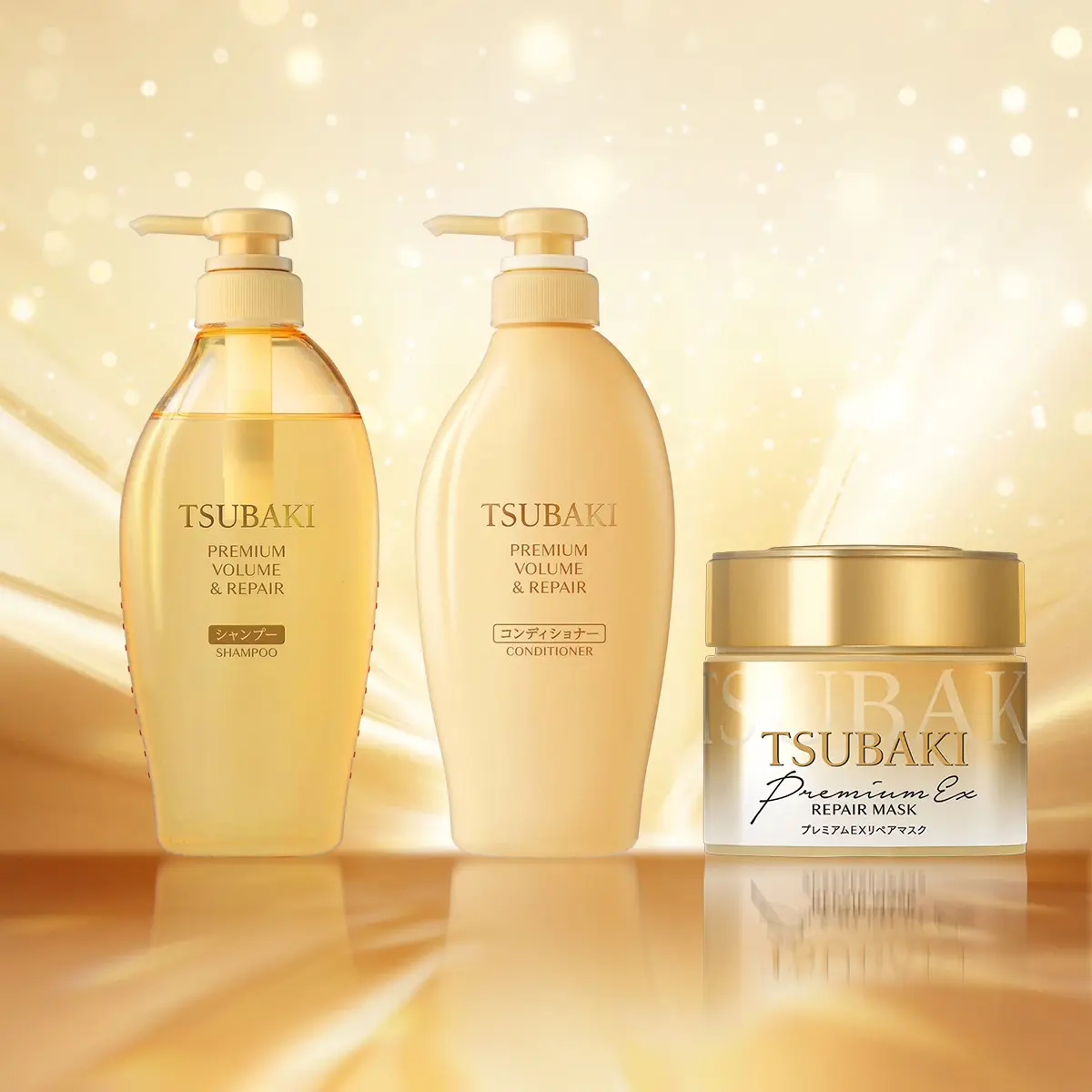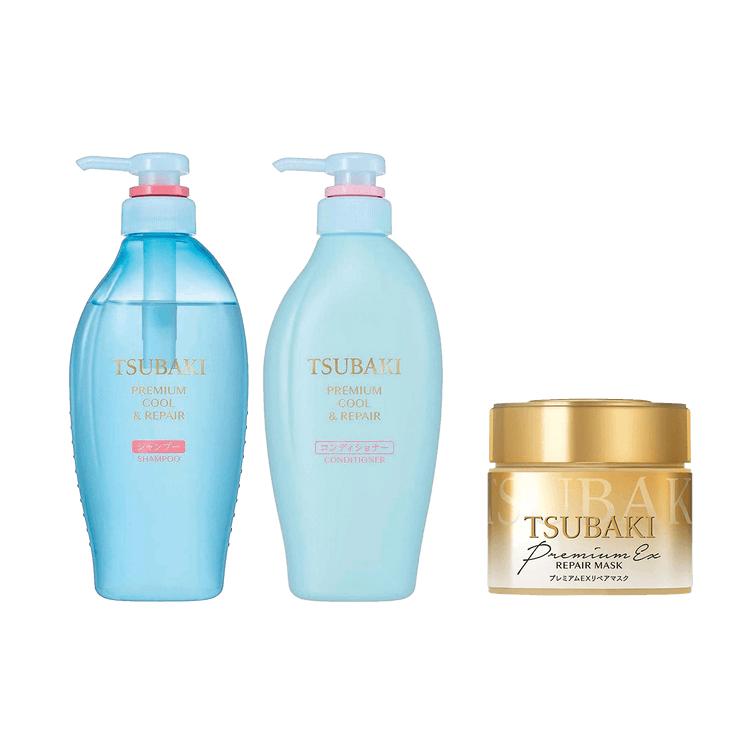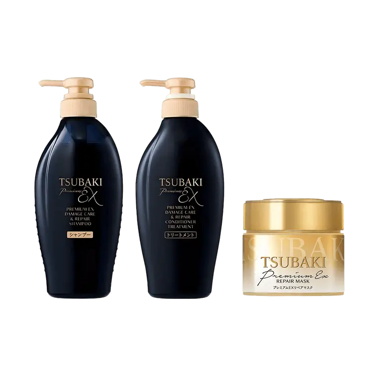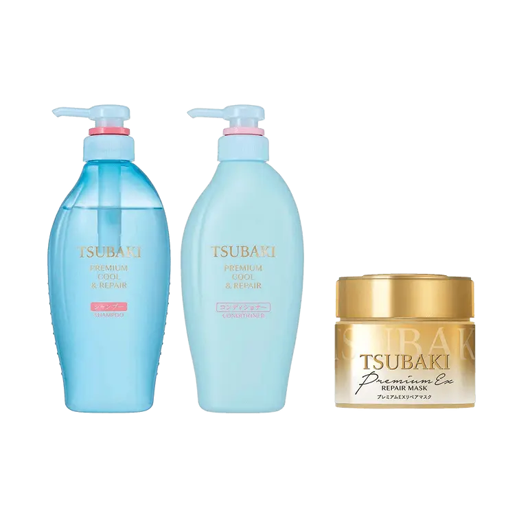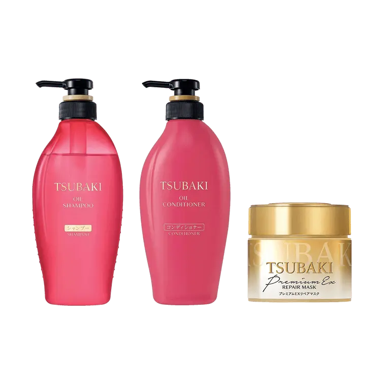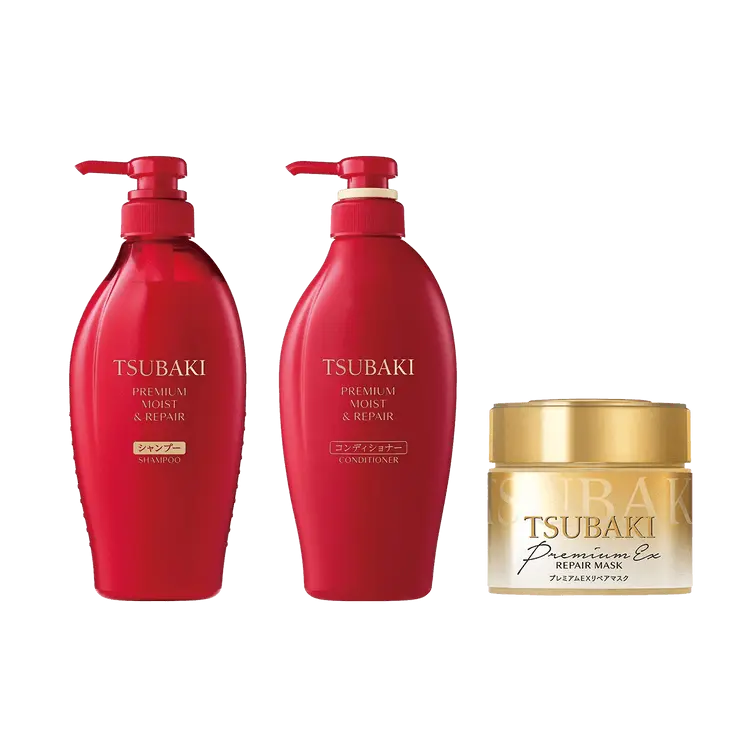 Discover the secret to luscious, salon-quality hair at home with TSUBAKI's premium hair care set. Featuring the Golden Repair Hair Mask enriched with camellia oil, and a deeply moisturizing shampoo & conditioner duo.