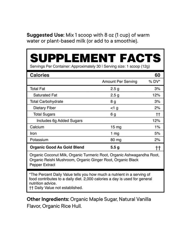 I had tried about 4-5 other golden milk powders before this one and they all missed the point of it being a TURMERIC latte. This one has all focus on turmeric & irs appreciated! You taste turmeric first followed by a nice hint of ginger and rounded off by a nice vanilla flavor. I love that it doesn’t have stevia as well & has maple sugar and also has the coconut milk. I do wish it had lions mane in it but I purchased a mushroom power to add to it just a pinch & I do add a pinch of cinnamon(very small amounts of both). After 4-5 lattes - Good as Gold is really as good as gold! It’s the one I’m sticking with! I have it every morning!
