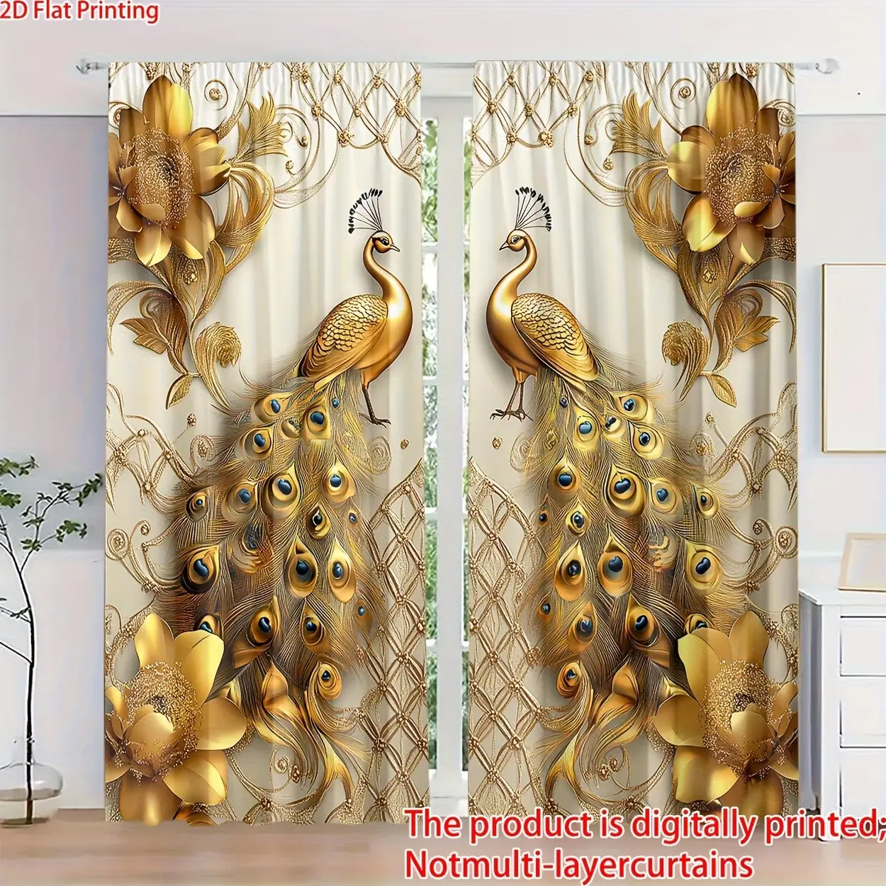 2 pieces, 2D flat printing, polyester material, digitally printed golden peacock pattern filtering curtains, suitable for bedroom, living room, office and home decoration, pole pocket design, suitable for hanging on poles