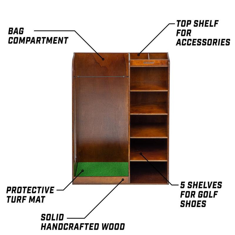 Keep your golf equipment and accessories looking neat and professional! The GoSports Premium Wooden Golf Organizer is a stylish space-saving solution for neatly storing golf equipment while keeping it on hand. The premium build features sturdy wood construction and is stained brown for a clean look that complements any home, office, garage and more. Don't settle for flimsy metal wire storage racks! Upgrade with multiple heavy-duty storage compartments (golf bag compartment, 5 shelves) with enough space to store virtually of your equipment. Rounded edges protect your equipment from snagging, scratching and tears. The organizer includes illustrated step-by-step instructions for easy assembly; assembled size measures 17 L x 29 W x 37 H inches. The golf bag compartment measures 16 L x 16 W x 36 H inches. The shelves measure 11 W x 6.5 H and range from 11 inches deep to 16 inches deep. Store and display your golf equipment with pride with the GoSports Premium Wooden Golf Organizer!