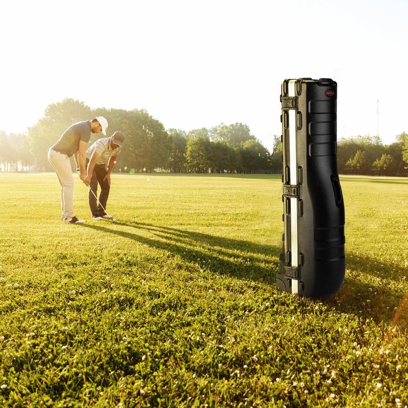 Keep your golf clubs safe while traveling with the SKB Cases ATA Deluxe Golf Bag Travel Case. Made from ultra-durable polyethylene, this case fits cart and carry bags, as well as drivers up to 48 inches. It features industrial-strength latches, a TSA Locking System, and a Perfect Match valence for secure travel. Ensure a proper fit and travel with peace of mind.
