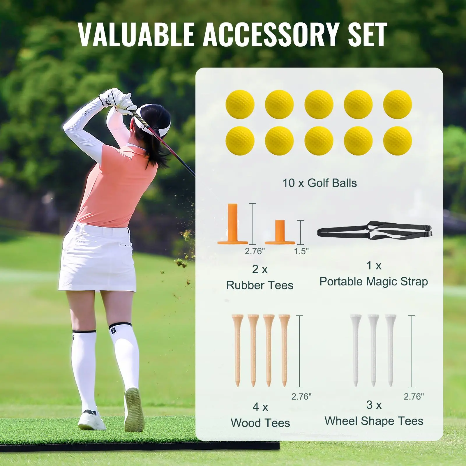 • Valuable Accessory Set: The golf mat set comes with a comprehensive accessory set, making it perfect for both indoor and outdoor use. The set includes 10 golf balls, 4 wood tees, 3 wheel-shaped tees, 2 rubber tees, and a portable magic strap. Note: Do not place the mat outdoors for a long time.