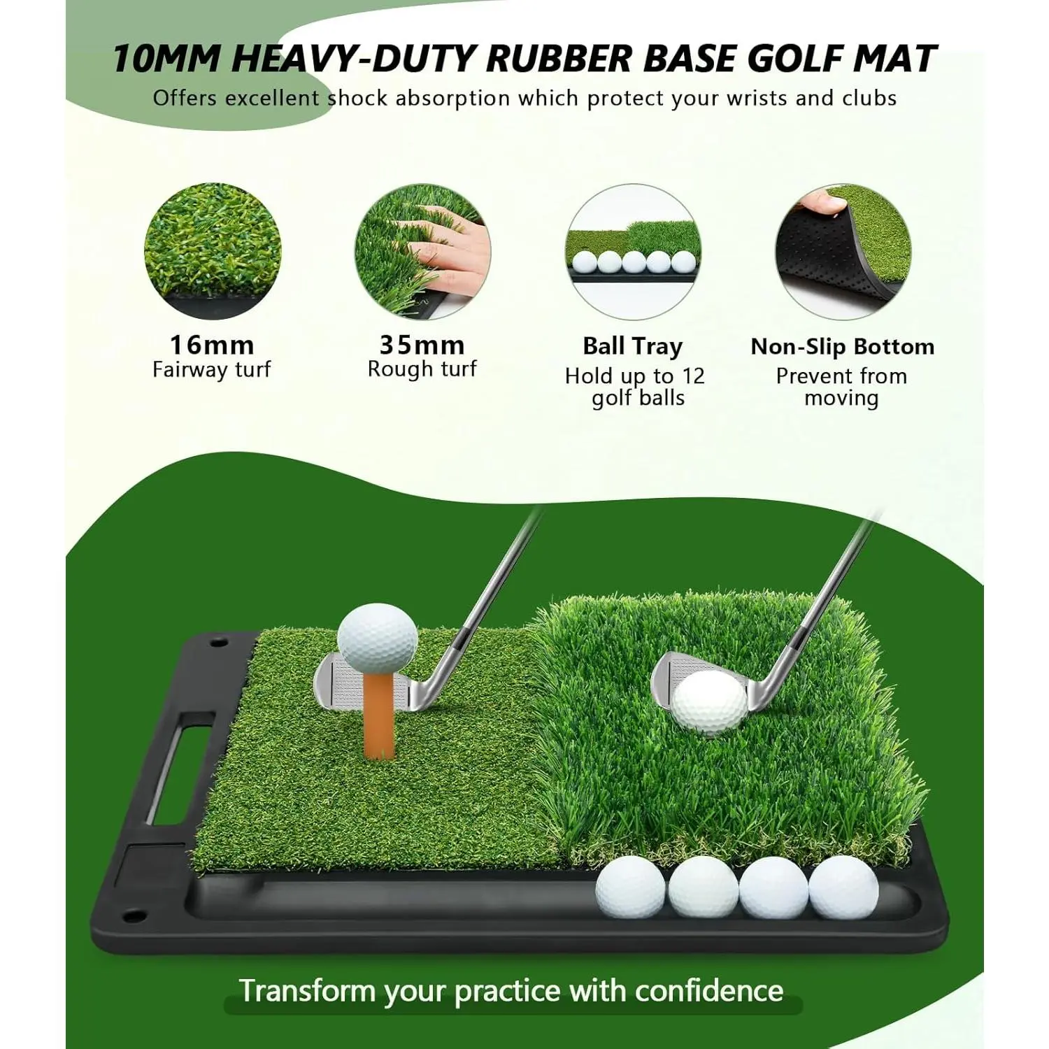 [🏌Easy to Set Up & Take Apart]This golf net is very easy to set up, it sets up easy with two crossing poles, much like a dome tent, anyone can do it.Takedown is also easy, just push the poles out instead of pulling.You can set a golf net up easily anywhere, indoor or outside, in the living room, backyard, or basement [🏌All-in-One Multiple Target Golf Net ]This golf net set equipped with a 10 x 7ft golf net, 18 x 12 inches heavy duty rubber base dual-turf golf mat, 5 x golf balls, 1x rubber tee, 1 x large capacity carrying bag & 4 x ground stakes for which you can complete all your golf practice [🏌High Quality-Robust Durability Golf Net]This golf practice net is made of high-quality 600D Oxford cloth and 260G shock-absorbing nylon net, enhanced durability and tear resistance that can withstand heavy impacts and long-term use.0.45" diameter sturdy fiberglass frame secures the net, like a tent, allowing it to stand firmly on the ground [🏌Newly Upgraded Golf Net and Heavy Base Dual-Turf Golf Mat]This All-in-One golf hitting net system comes with a heavy rubber base dual-turf golf mat, which enhances the grip of the mat, prevents the mat from moving when you hit the ball, protects your wrists and clubs, and the mat also has a ball tray, which eliminates the hassle of picking up the balls all the time, making it very convenient for practicing golf [🏌Swing Anytime & Anywhere]Having this golf nets systems can be a game changer for your daily golf practice, not only does it allow you to start your golf practice anytime, anywhere, taking it outside when the weather is nice and indoors when the weather is bad, but it also saves you the time and hassle of traveling to the driving range so often. It's also the Ideal gifts for men, dad, husband, boys, golf beginners, and golfers