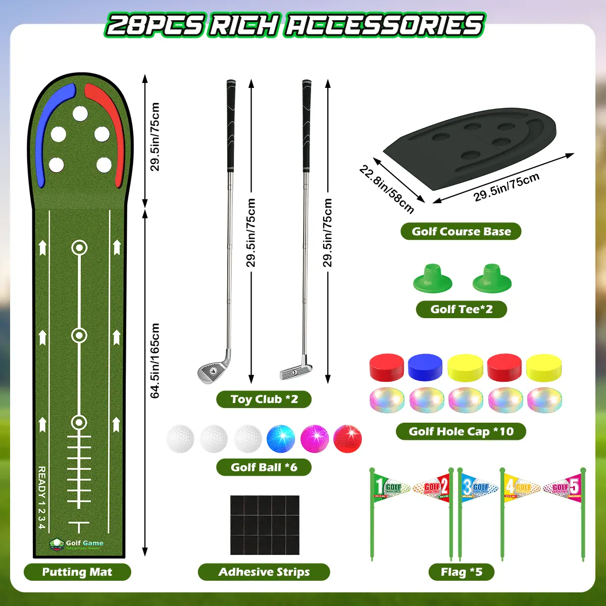 This Toy golf ball sets includes everything kids need to start the game, including Golf Putting Mat*1, Golf Slop Base*1, Light up Holes*5, Golf Hole Plugs*5, Toy Clubs*2, Lighting Golf Balls*3, White Golf Balls*3, Golf Tees*2, Golf Flags*5, Sticker*1.