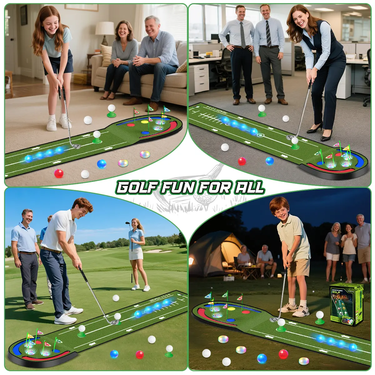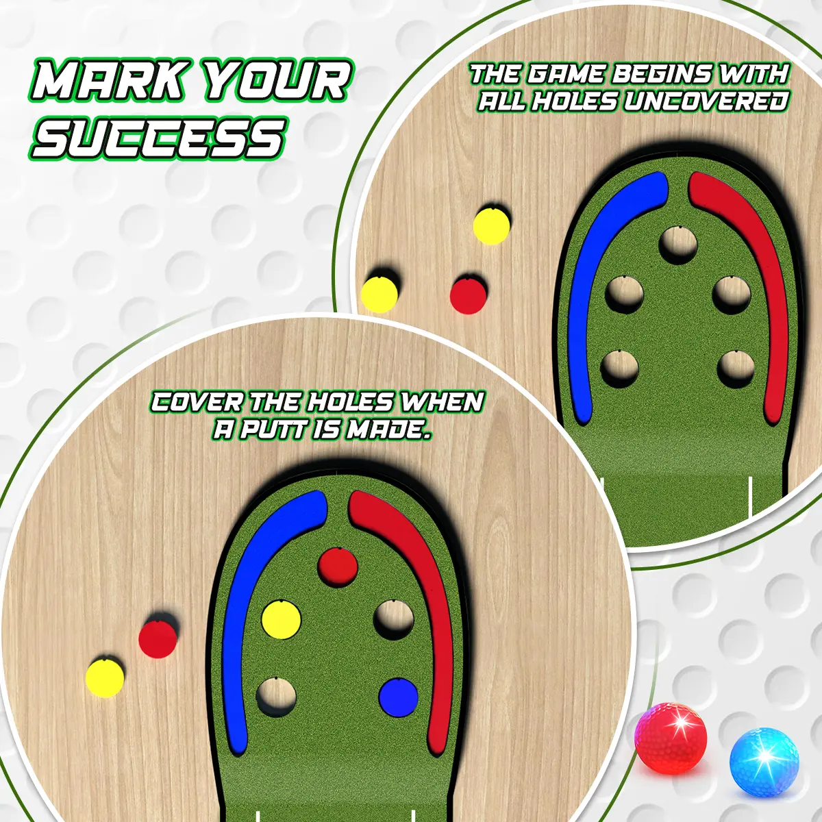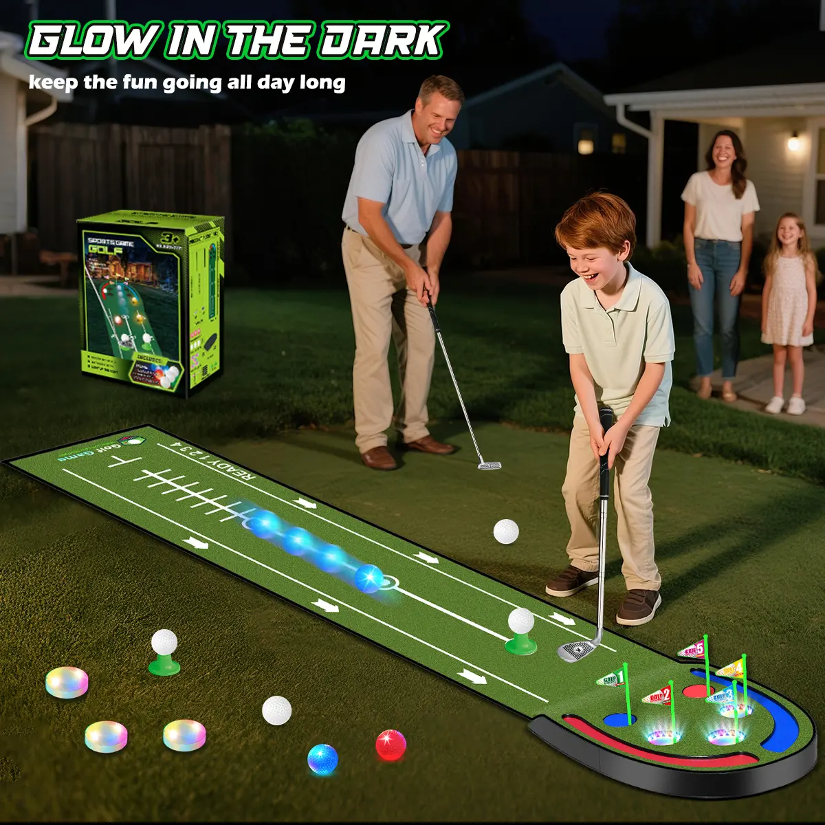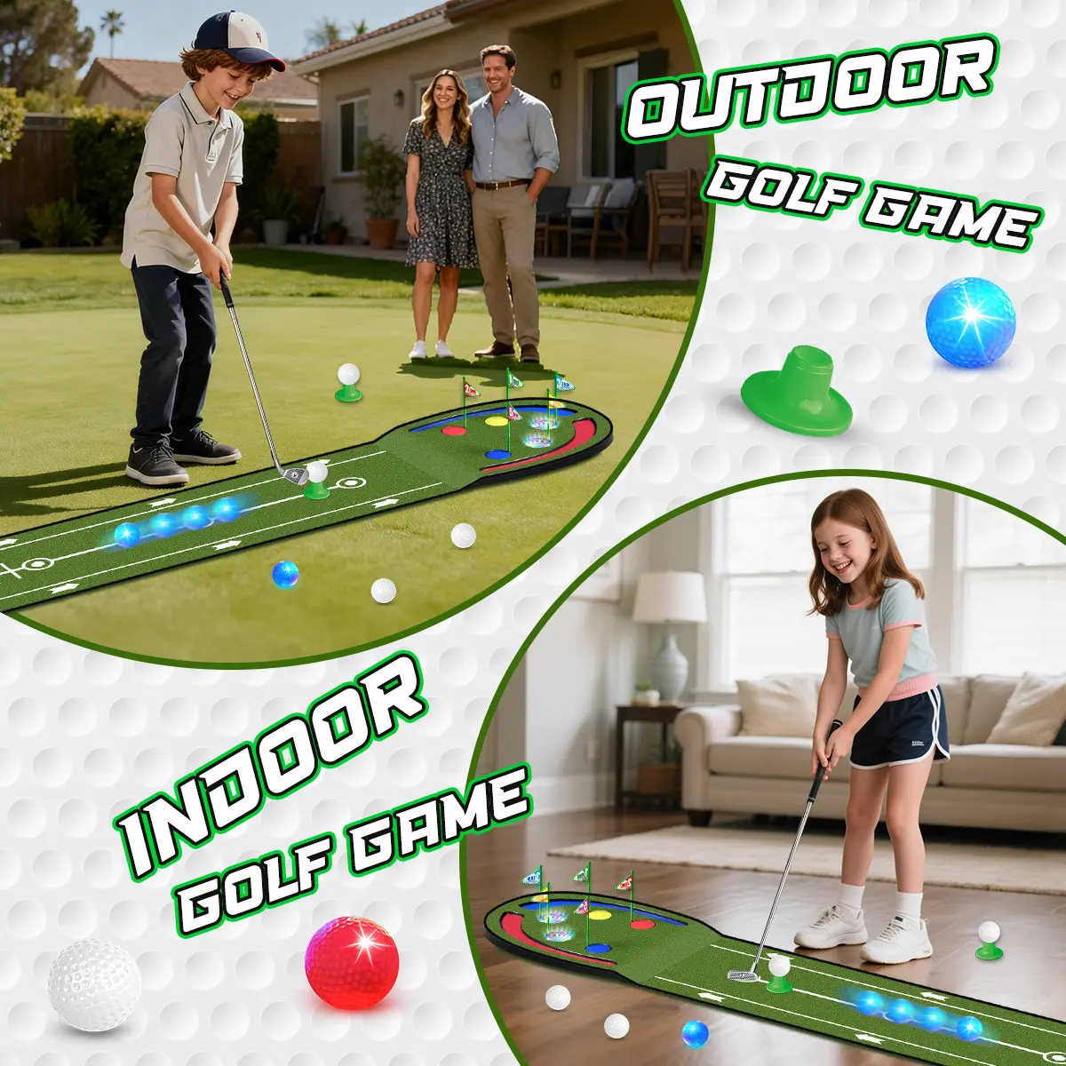Get ready for that 9-hole and 18-hole games while having fun with VATOS Toy Golf Putting Mat Set, enjoy nighttime putting fun and precision practice anytime, anywhere with our exclusive light-up golf holes and glowing golf balls.