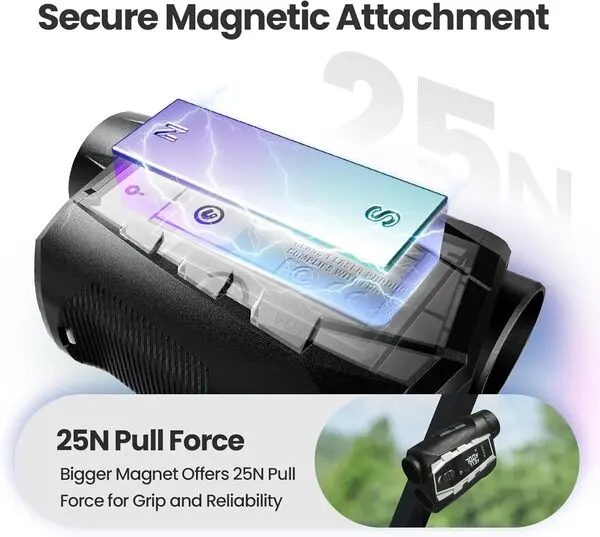 ·【N95 Strong Magnet, Long-Lasting Battery】Featuring an N95 strong magnet, the rangefinder golf securely attaches to metal surfaces like golf carts or clubs, ensuring it stays put even during vigorous play. The built-in 1000mAh battery provides long-lasting power, supporting up to 40,000 uses per charge. We always provide 2-year assurance and technical support for its golf range finders. If you have any problems with this range finder, please reach out to our after-sales team.