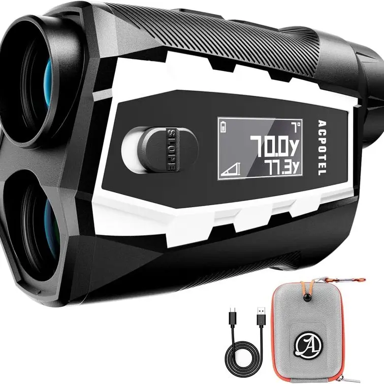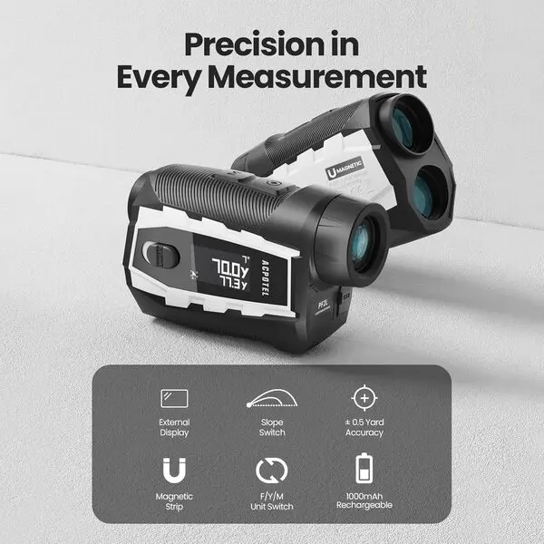 ·【ACPOTEL All-in-One Golf Range finder】Designed for golf, disc golf, and hunting. This rangefinder features an external LCD display for clear readability in various lighting conditions. It includes a slope switching function for accurate measurements on uneven terrain. The magnetic strip ensures secure attachment, while the device can measure distances up to 1000 yards. With a USB-C charging port for fast charging, the rangefinder combines functionality and reliability in one compact device.