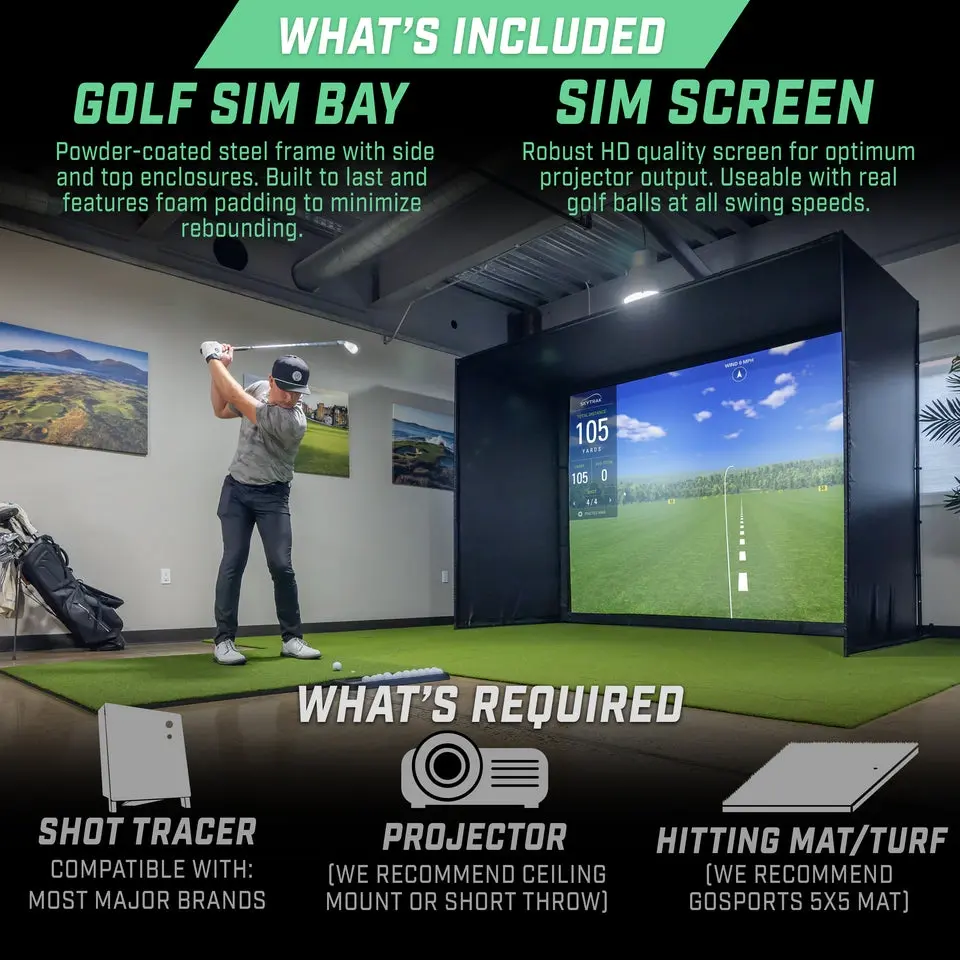 GoSports 10 x 8 ft Golf Simulator Enclosure brings the course to your home! The ideal 4:3 aspect ratio screen with side and top coverings makes it an indispensable training aid for serious golfers who want the best. The enclosure features commercial grade quality at a significantly lower cost, making it an affordable choice for setting up a home driving range. This indoor practice solution is compatible with all leading launch monitors and projectors, although devices are not included. The impact screen, made of high-density woven polyester, ensures a reliable and durable projection surface. Assembly is easy, with comprehensive instructions allowing you to set up in 30 minutes or less, assuming a room height of 9 feet and adequate space for swinging. Built for durability, the setup includes a sturdy steel frame and reinforced impact screen, with foam padding to minimize rebounds and prevent balls from slipping underneath.