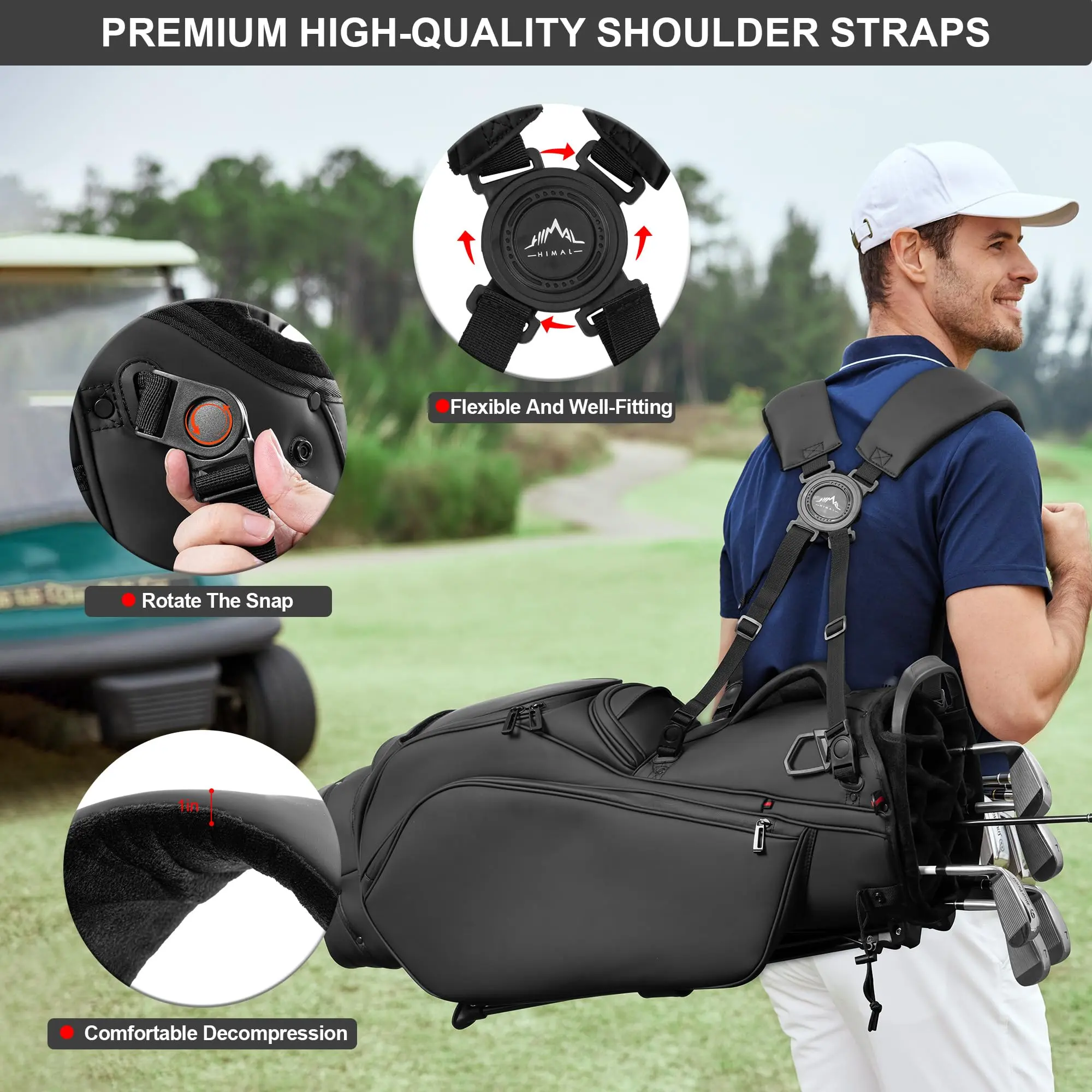 【Self-Adjusting Double Shoulder Straps】The golf stand bag with our ergonomically designed double shoulder straps. Straps featuring 360° rotating discs and four-directional self-adjusting mechanism, automatically adapt to your gait and movement. Golf bags straps distribute weight evenly, reducing fatigue and keeping you focused on your game.