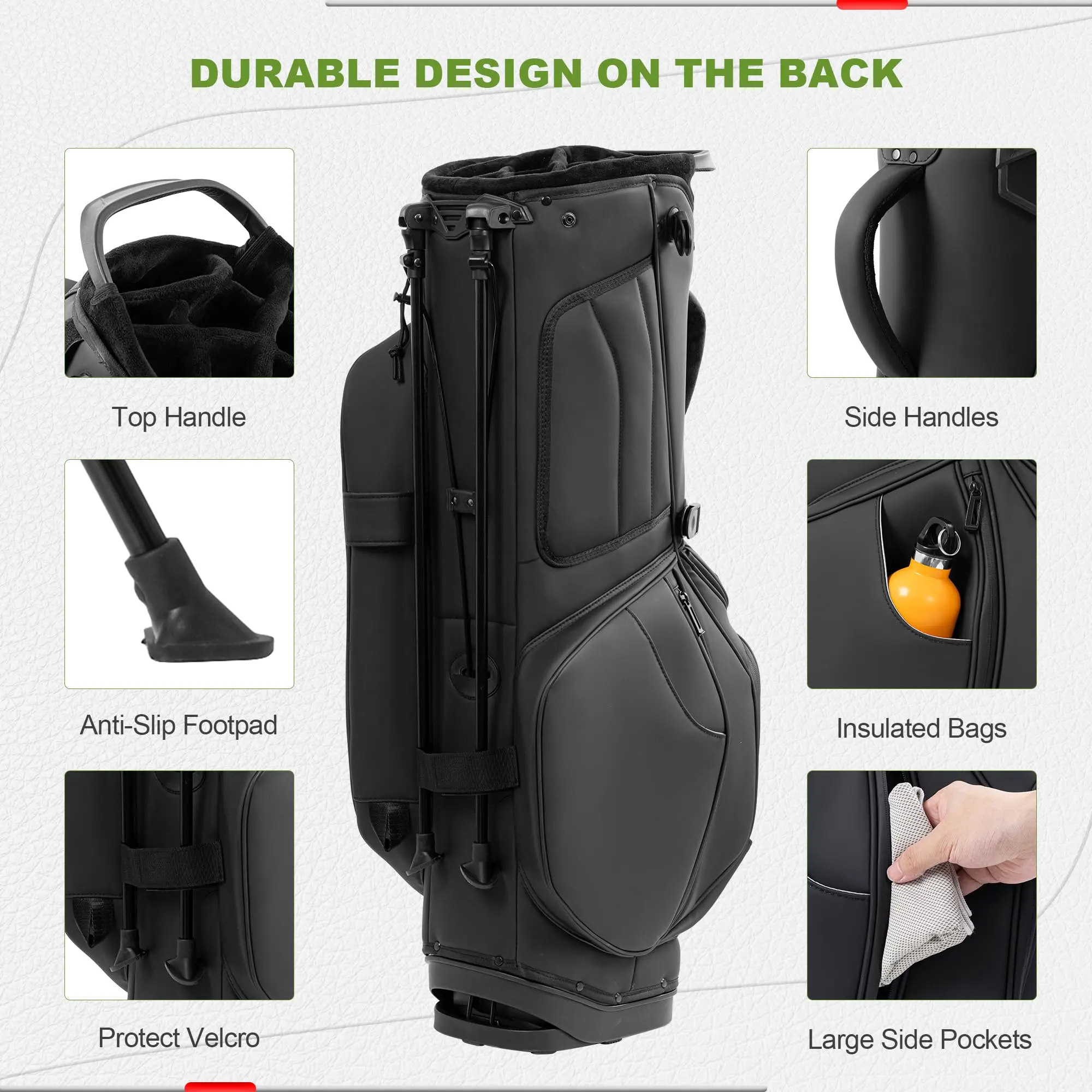【Quick Release Anti-Slip Bracket Legs】This leather golf bag easy release stand legs strap to secure legs when not in use, which is designed for using in different terrain. The solid circular base protects the club by standing firmly on level ground.
