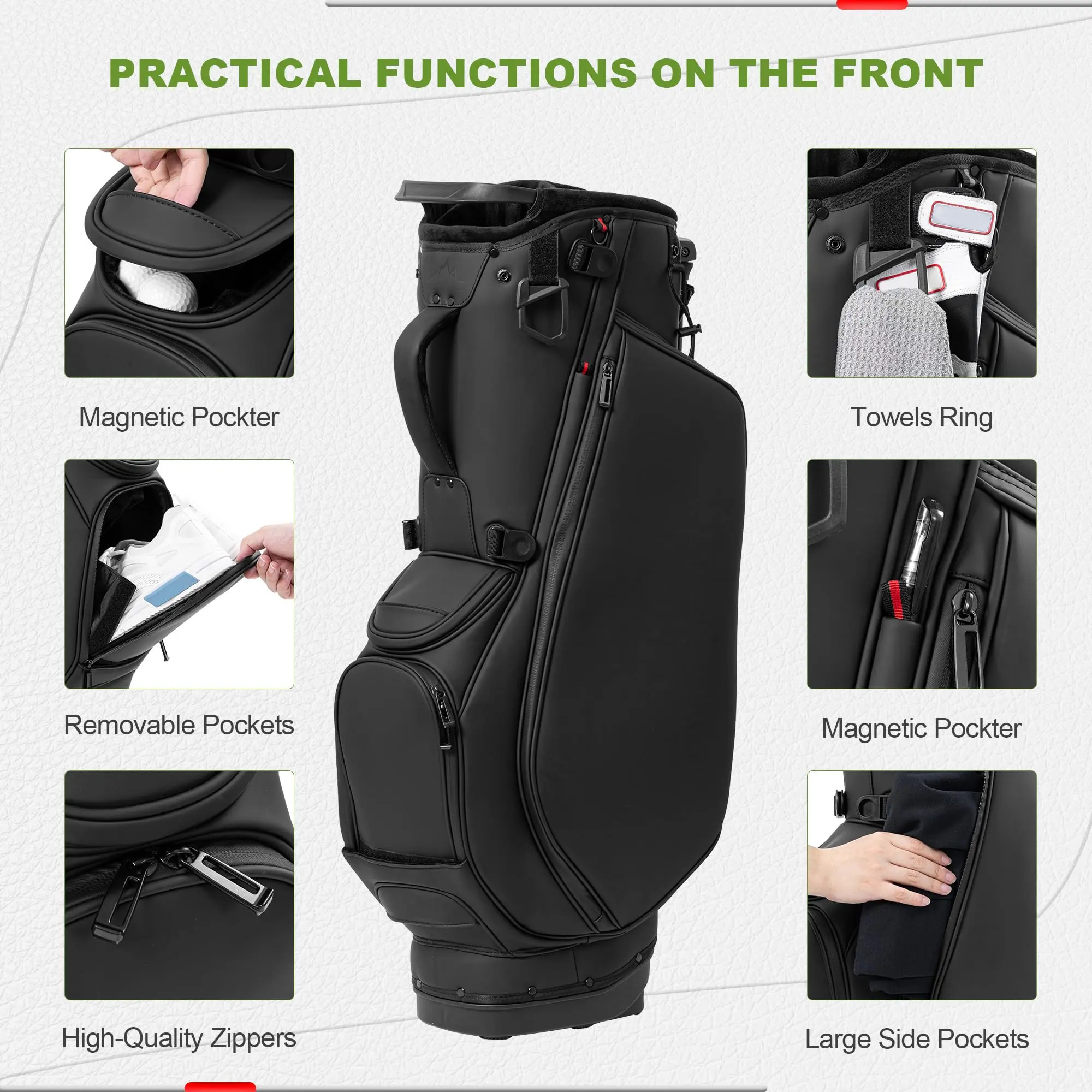 【Premium Faux Leather Materials】This men's golf bag is made of high quality leather fabric with a soft and luxurious feel and a smooth and shiny look, equipped with a specialized rain cover that not only looks premium but also protects your golf clubs and equipment from rain.