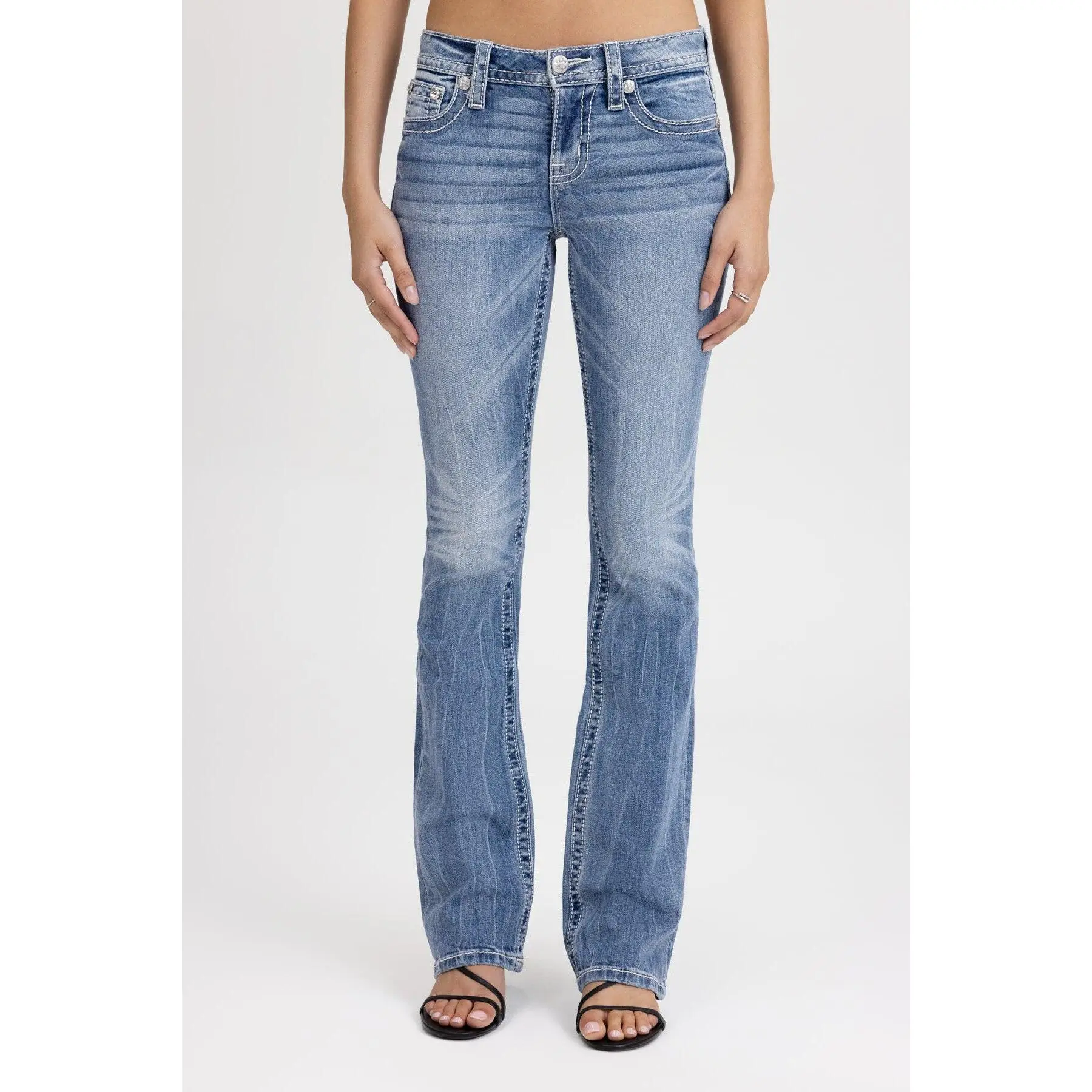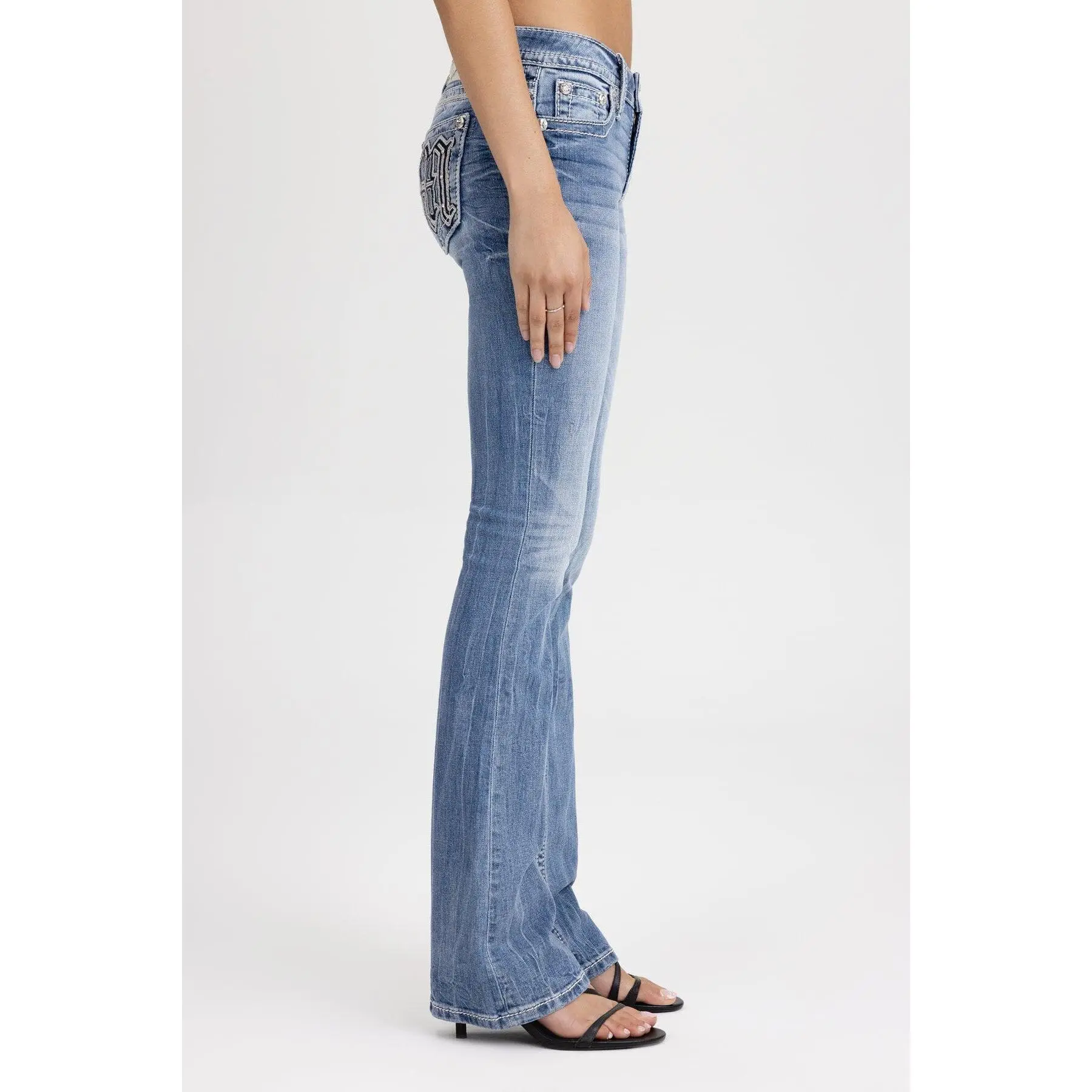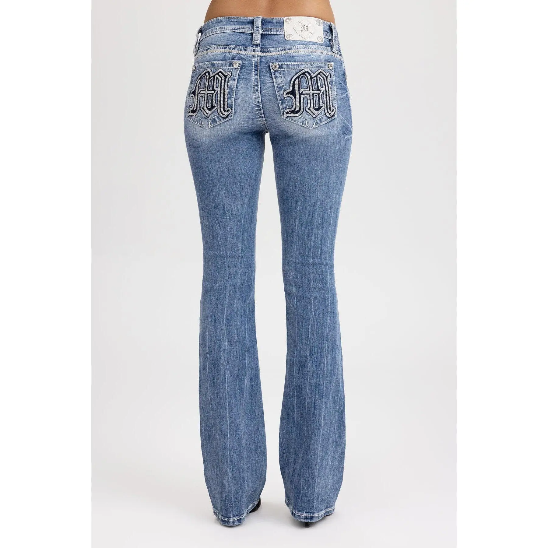 Washed, mid-rise bootcut jeans - Embroidered gothic "M" logo design - Mini contrast arrowhead stitch detailing - Rhinestone rivet accents - Embossed white studded leather cross Miss Me brand patch - Whiskering details - 5-pocket design
