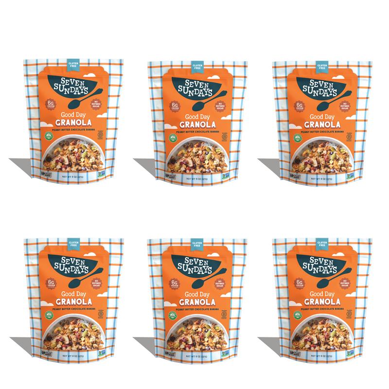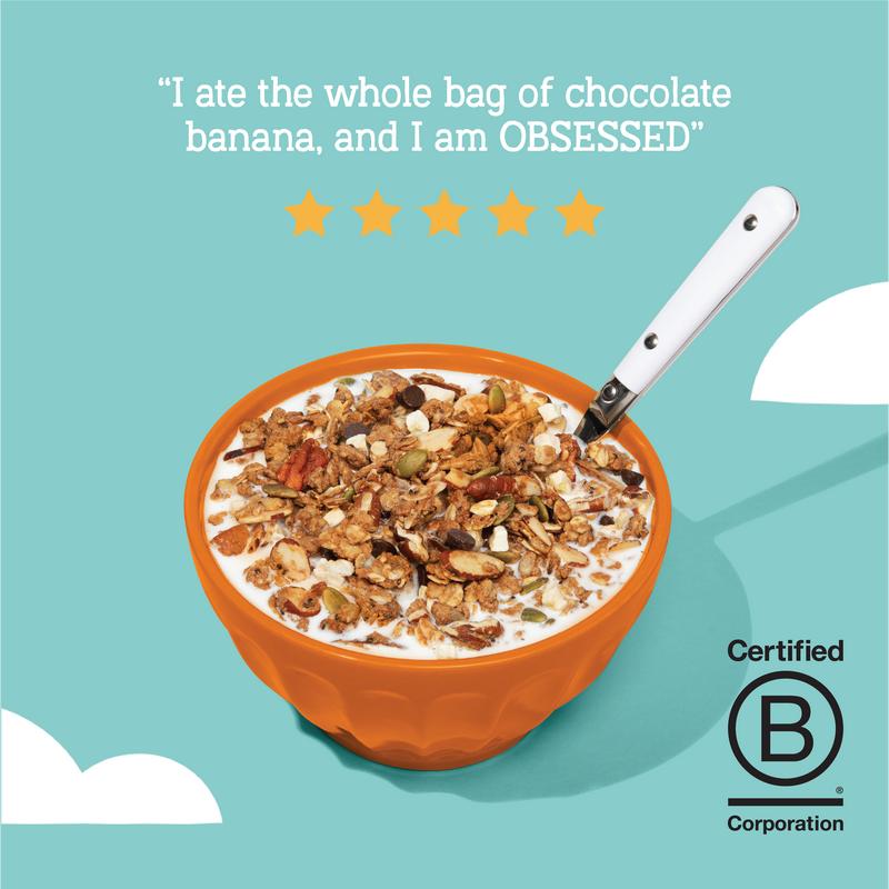 Meet our Good Day mix—a craveworthy peanut buttery chocolate banana granola. Top your yogurt, serve with milk, or eat it straight outta the bag.