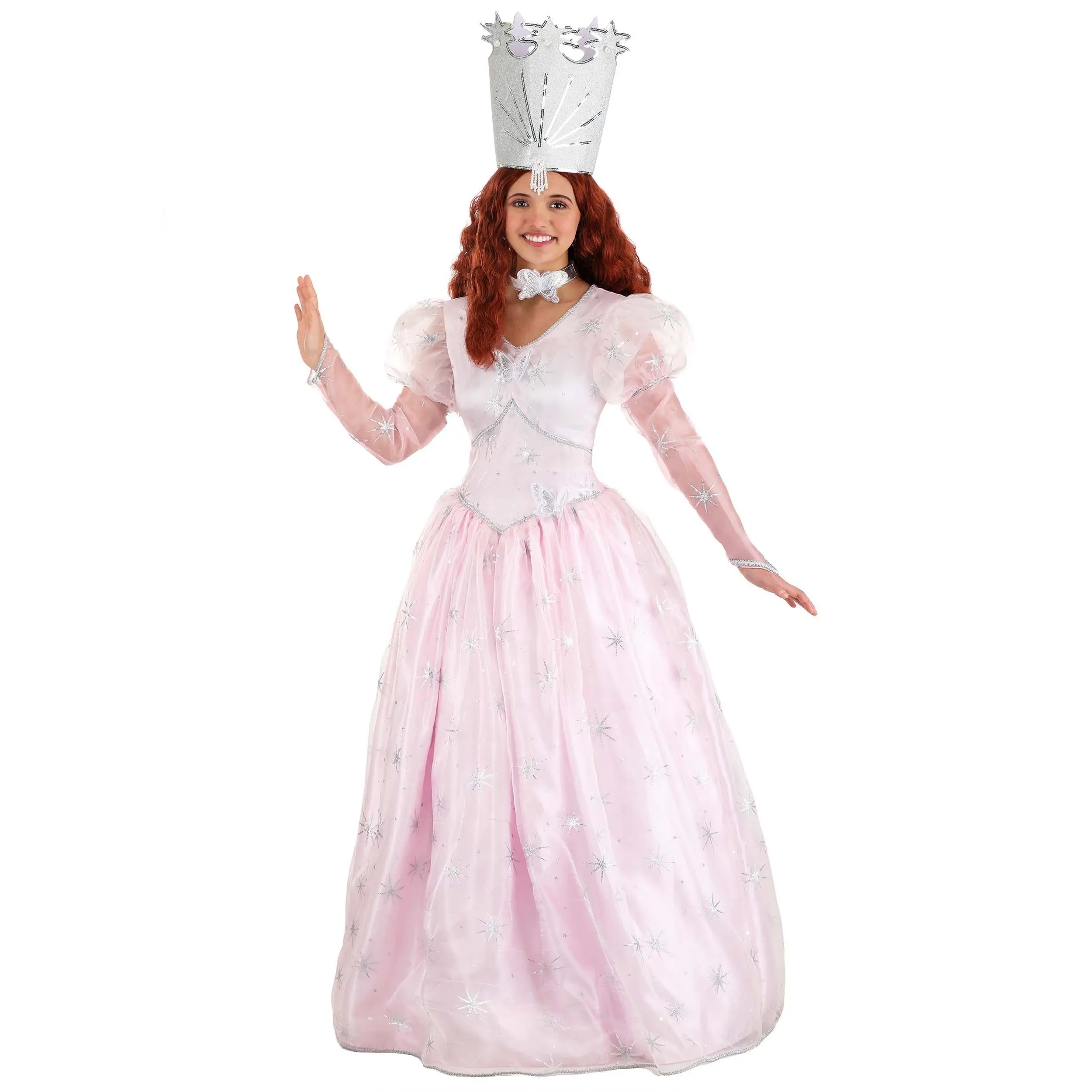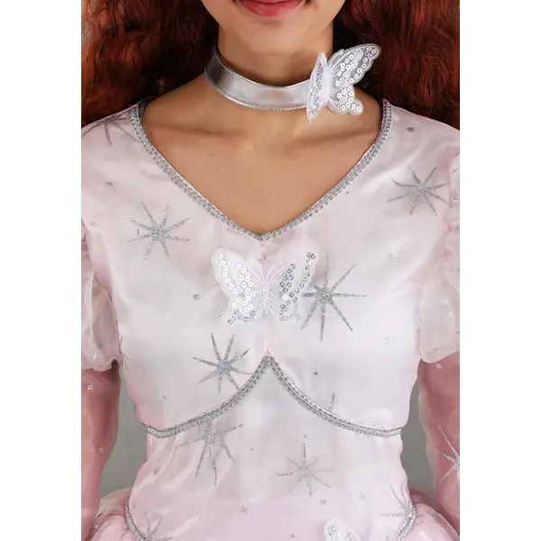 Remind Dorothy to close her eyes, tap her heels together, and tell herself that there's no place like home! This exclusive Deluxe Good Glinda Costume for Women will infuse your next costume event with the magic of a wonderful fairy tale. A long pink gown with an top layer of silvery mesh decorated with sparkly star detail will make you feel like a magical queen. Puffed sleeves and a silvery butterfly choker add to the fun, as does the tall silvery crown decked in sequins.