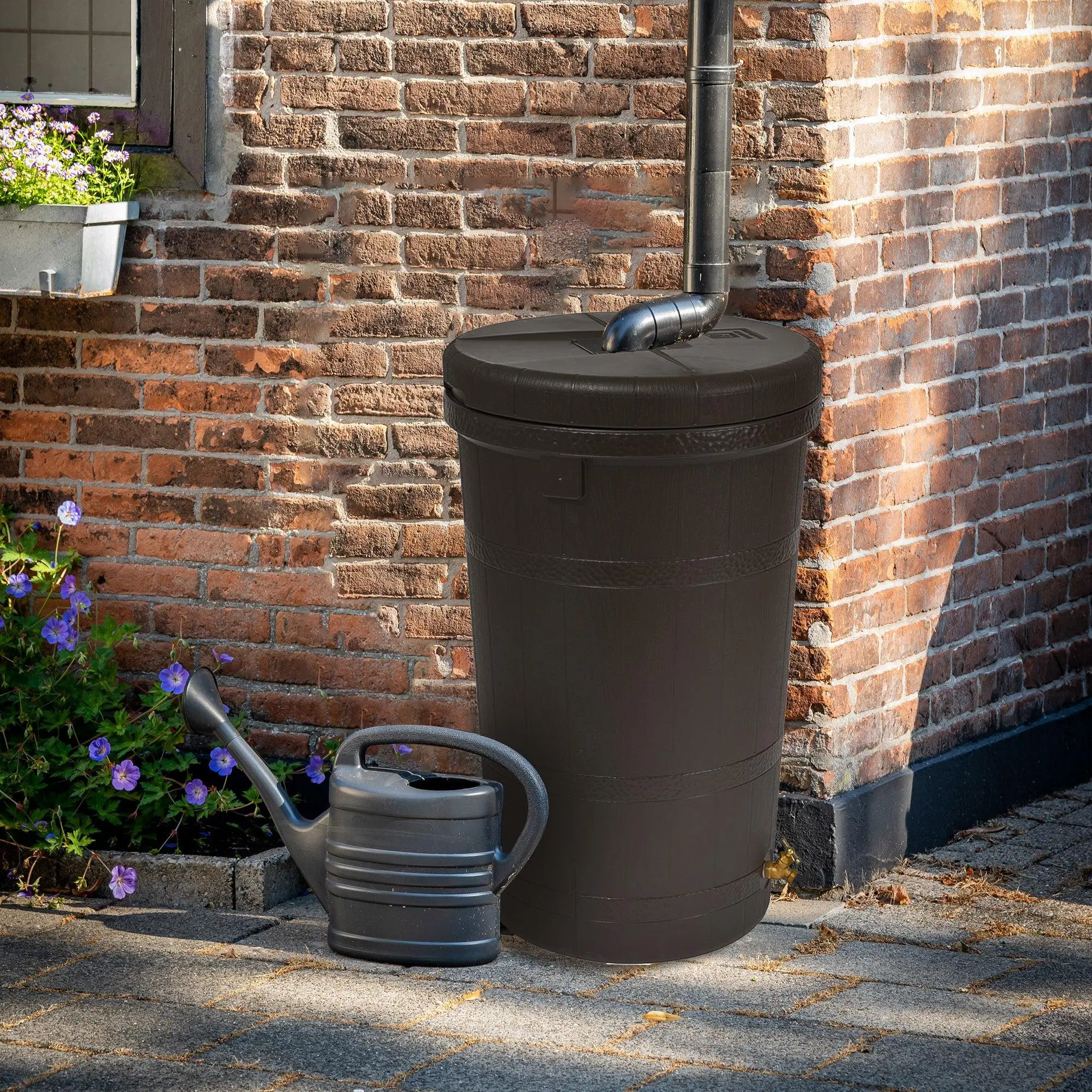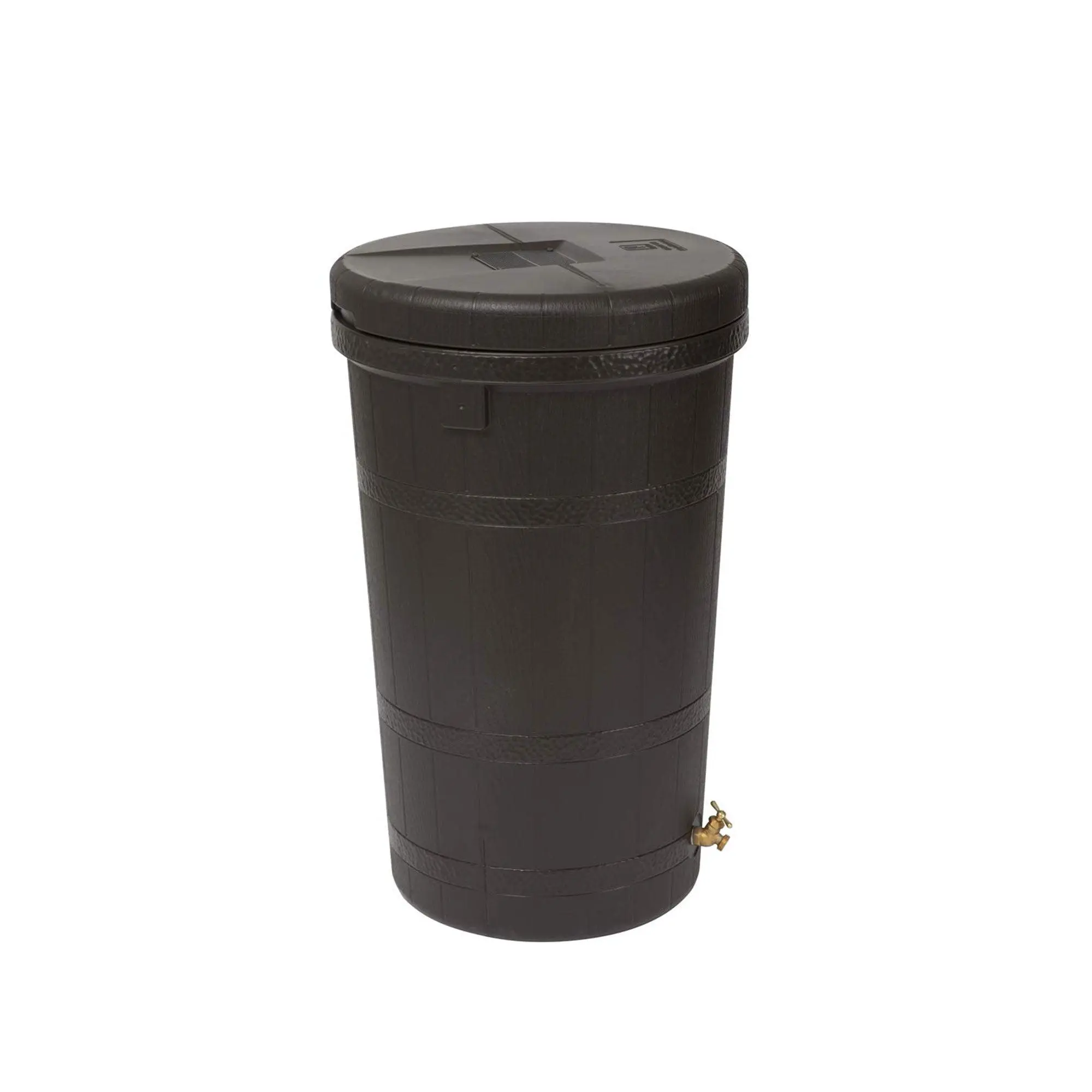 Make a stylish contribution to environmental conservation using the Good Ideas 50-Gallon Rain Barrel in your daily routine. This thoughtfully designed rain barrel, boasting a generous 50-gallon capacity, is an ideal starting point for your eco-conscious endeavors.Enhancing the appeal of your outdoor space, the water barrel features an attractive brown hue and a finish that mimics the texture of wood grain slats, providing a realistic and visually pleasing aesthetic. The inclusion of a worked-metal-ring texture further adds to its authentic appearance. The barrel is conveniently divided into two pieces, with a user-friendly, easy-to-remove lid that simplifies the cleaning process, ensuring that maintenance is a breeze. Beyond its visual appeal, these rain barrels prioritize functionality with double brass spigots and a mesh screen. These features keep pests at bay and effectively filter out any undesirable debris from your collected rainwater. The barrel's design incorporates drill points, facilitating secure lid attachment and ensuring durability during adverse weather conditions. For added convenience, these barrels have a stand that provides ample space beneath the spigot. This feature lets you position buckets, pails, or other water carriers underneath, making collecting and utilizing rainwater a seamless and efficient experience.Embrace sustainable living by harnessing the power of nature with the Good Ideas 50-gallon Rain Barrel.