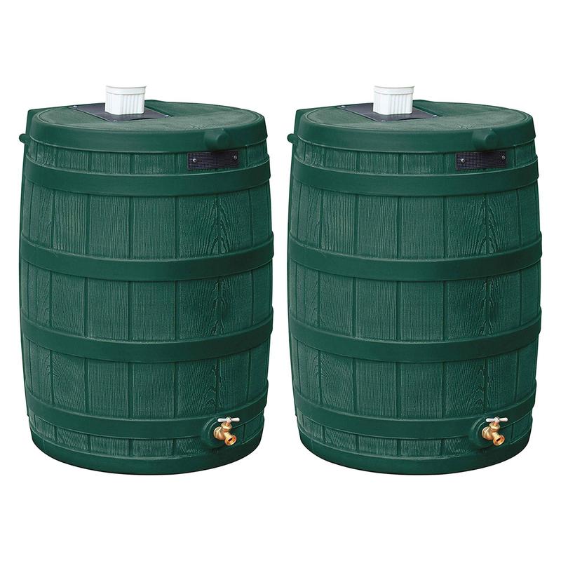 When drought sets in and rain is in short supply, rain barrels can provide that precious water you need for your lawn and garden. The 2-pack Good Ideas Rain Wizard Storage 50 Gallon Rain Barrel can provide 50 gallons of pure, un-chlorinated water when municipalities declare periods of low water usage.During heavy rainfalls, a typical roof can produce hundreds of gallons of water. By saving that water, you can reduce your average water usage by up to 40 percent. With those kinds of savings, the rain wizard can pay for itself in just a few seasons. The rain wizard features an attractive faux oak barrel design so it naturally fits in with your landscape. The wide variety of colors allows you to even further match your barrel to your home and yard even without standing out.A front-side overflow keeps water from flooding against your outside wall. The flat-back design is one of the most convenient features as it allows your barrel to sit right up against your home so you don't have to worry about purchasing excess downspout parts. These barrels are tough. While most barrels will crack or become brittle in the winter, the rain wizard will stay strong. It is still recommended that you drain your barrels when temperatures approach the freezing point.Keep your yard and garden watered naturally using the 2 packs of Good Ideas Rain Wizard Water Storage 50-Gallon Capacity Barrel from Good Ideas.