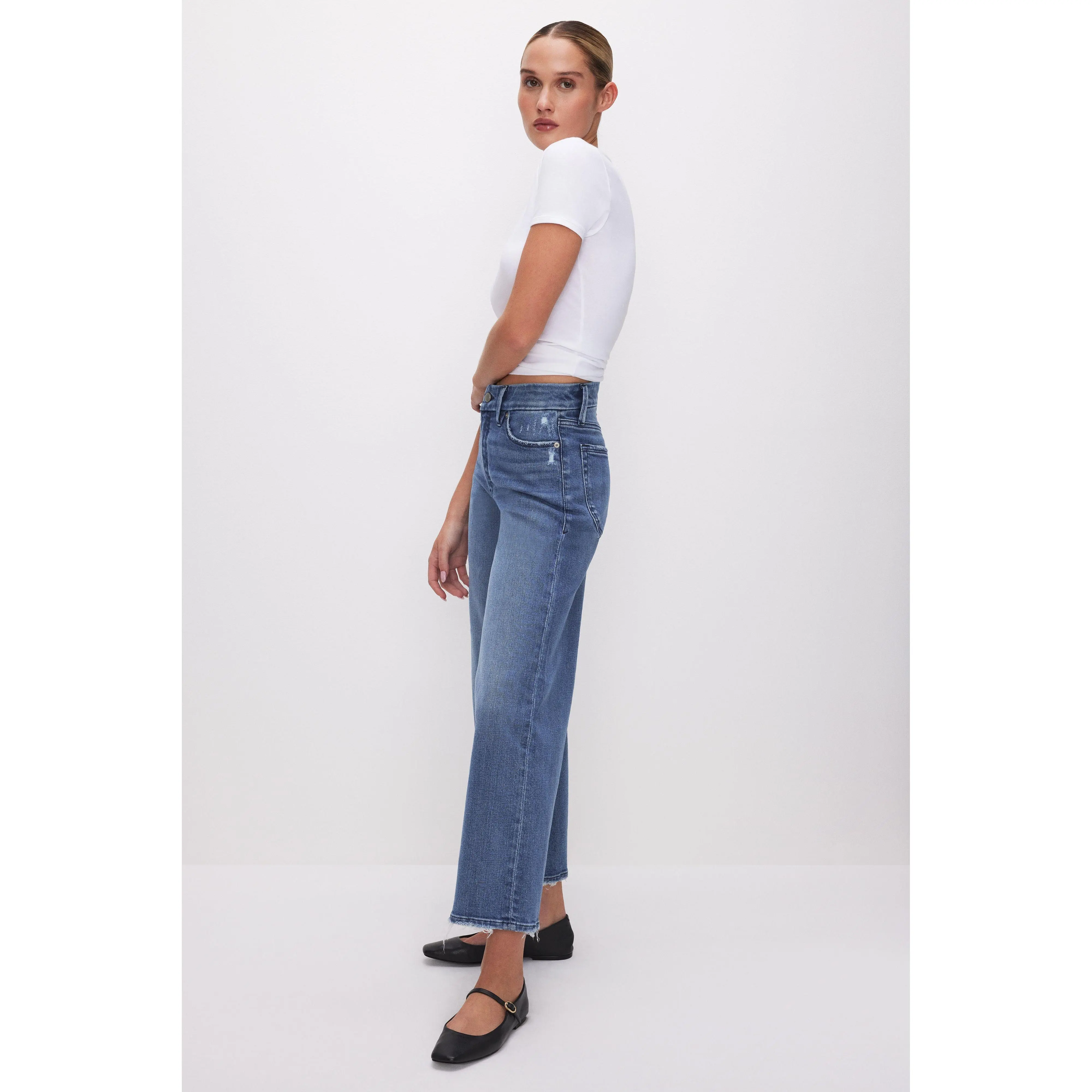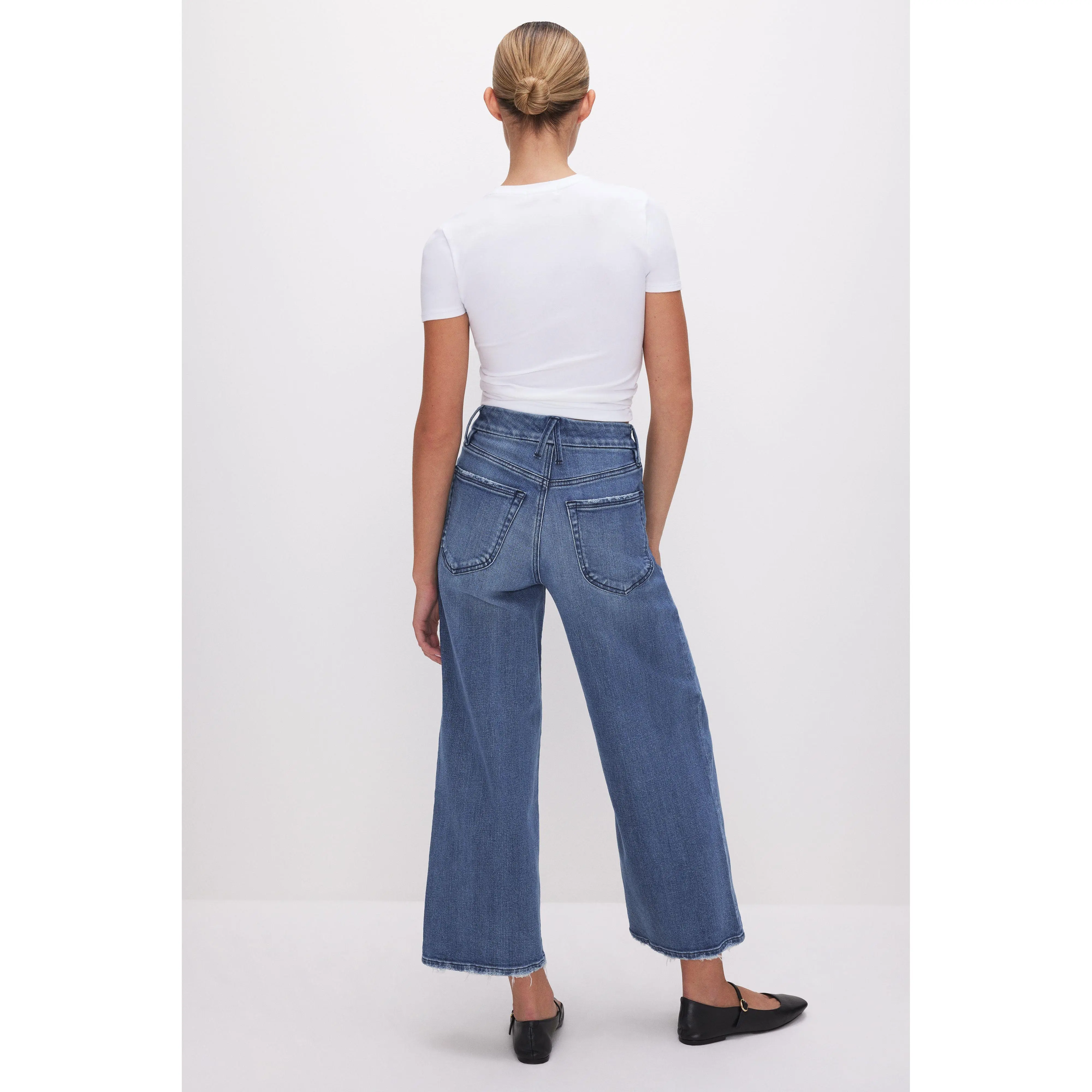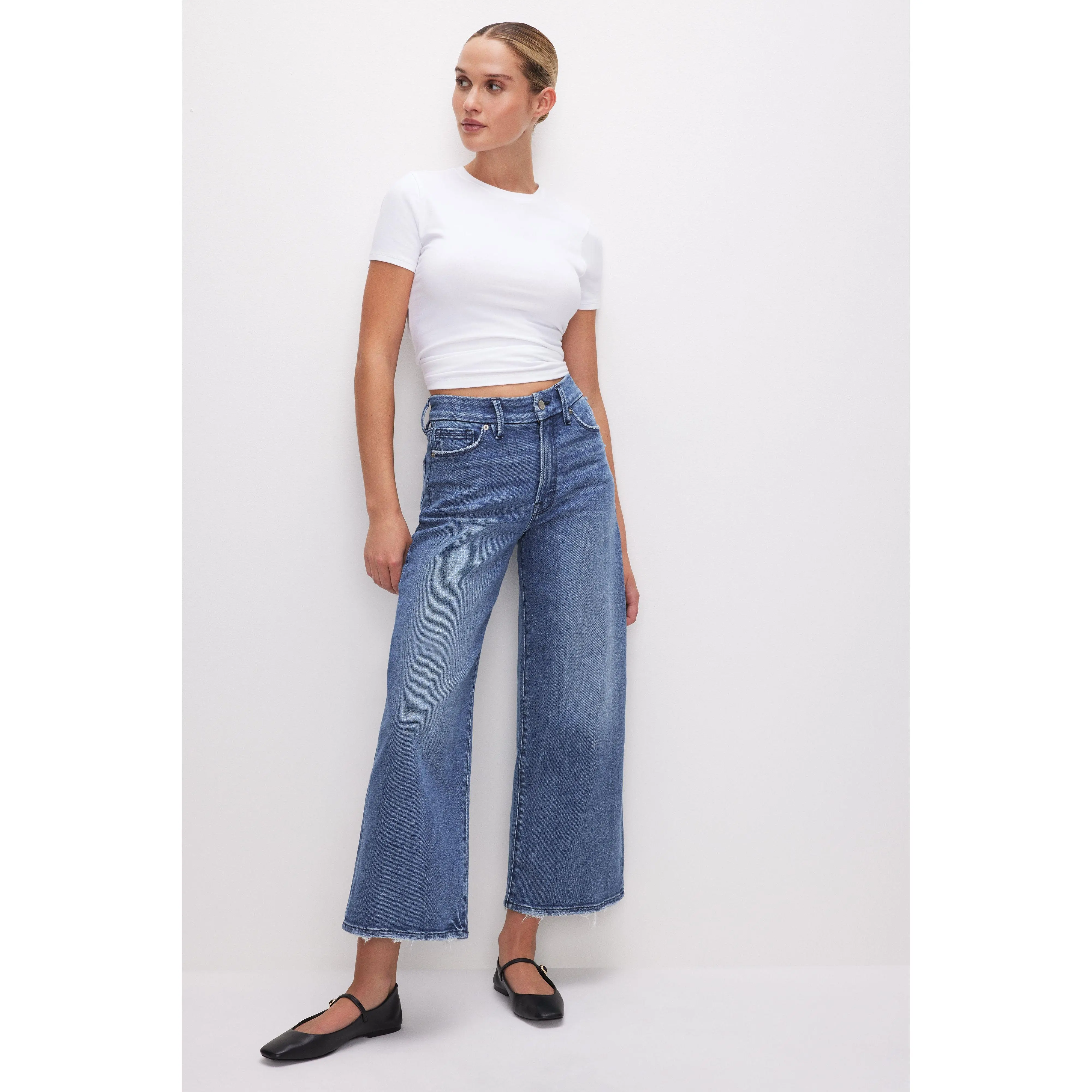 A sexy waist cinching style designed to enhance your natural silhouette with a high-rise and cropped wide loose legs. The Good Waist Cropped Palazzo Jeans are crafted from our comfort stretch denim, that has a classic denim look and feel, but with a little added stretch for comfort.