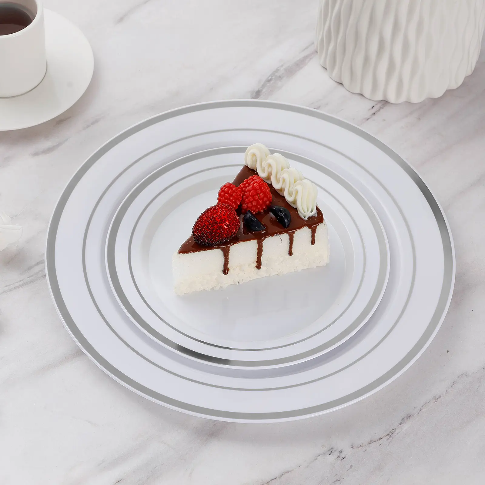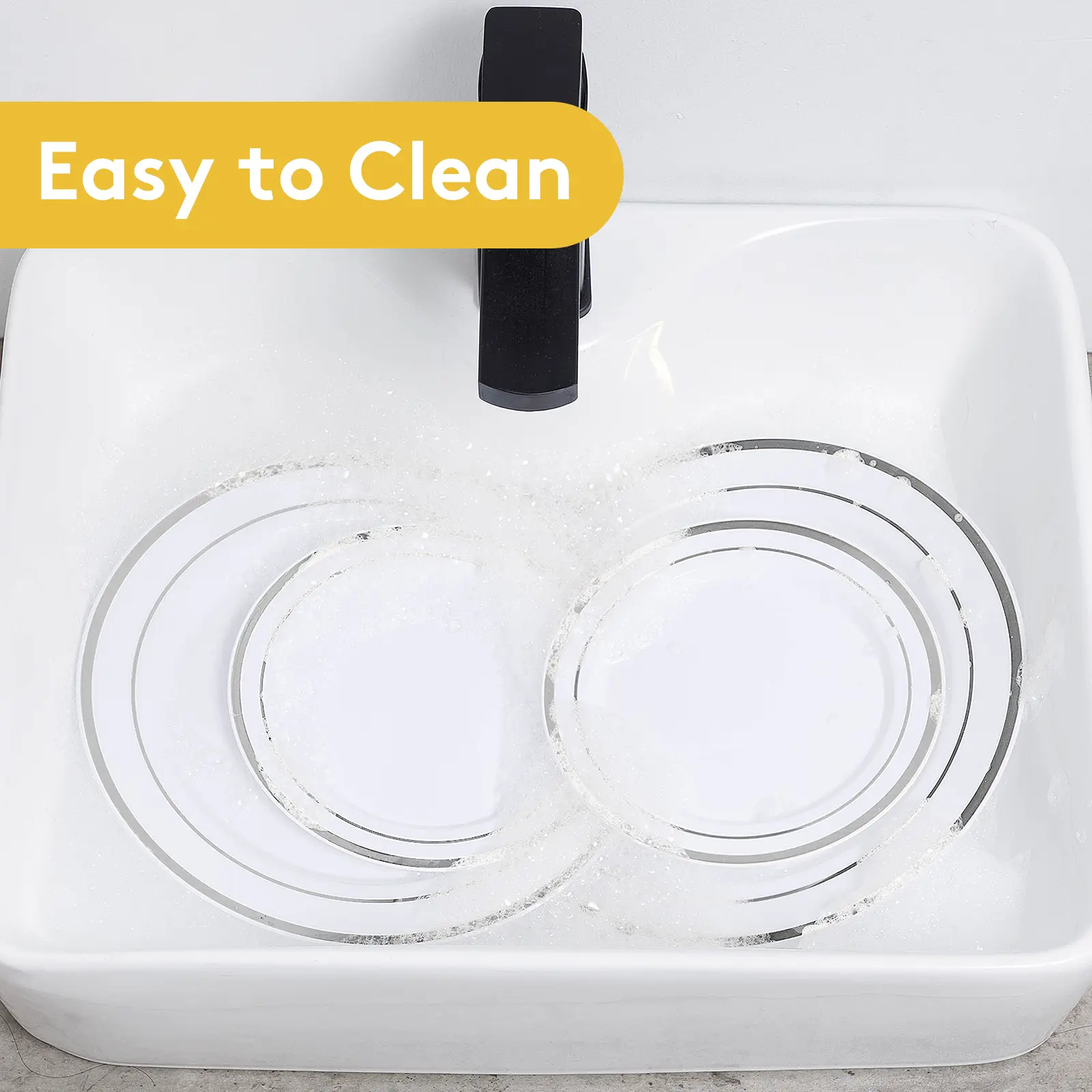 ELEGANT DESIGN – Featuring a sophisticated silver rim, these disposable plates bring the elegance of luxurious china to your table, instantly elevating any setting. Impress your guests with tableware that combines beauty and functionality, perfect for any special occasion.