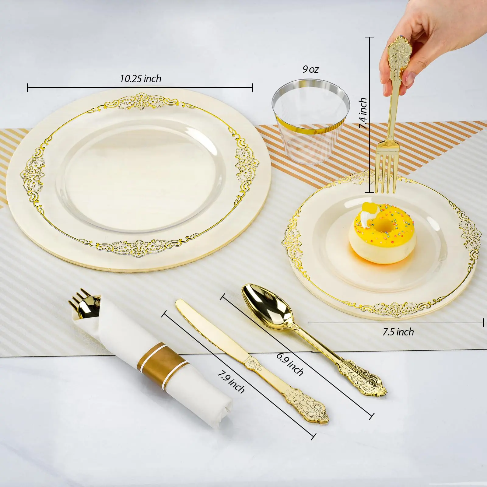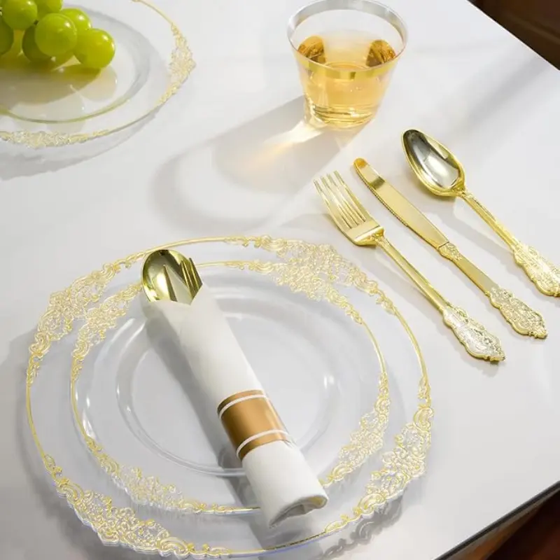 • Featuring a simple, elegant clear gold border, these plates add sophistication to any event. They look premium compared to basic paper plates. Ideal for weddings, birthdays, anniversaries, and holidays.