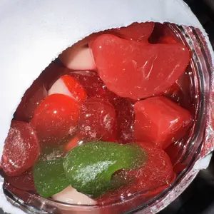 Ingredients: Corn syrup, high fructose corn syrup, glucose syrup, sugar, water, glycerin, gelatin, modified corn starch, sorbitol, citric acid, malic acid, tartaric acid, lactic acid, pectin, natural & artificial flavor, palm oil, carrageenan gum, xanthan gum, sodium malates, potassium sorbate, sodium benzoate, carnauba wax, and colorings.