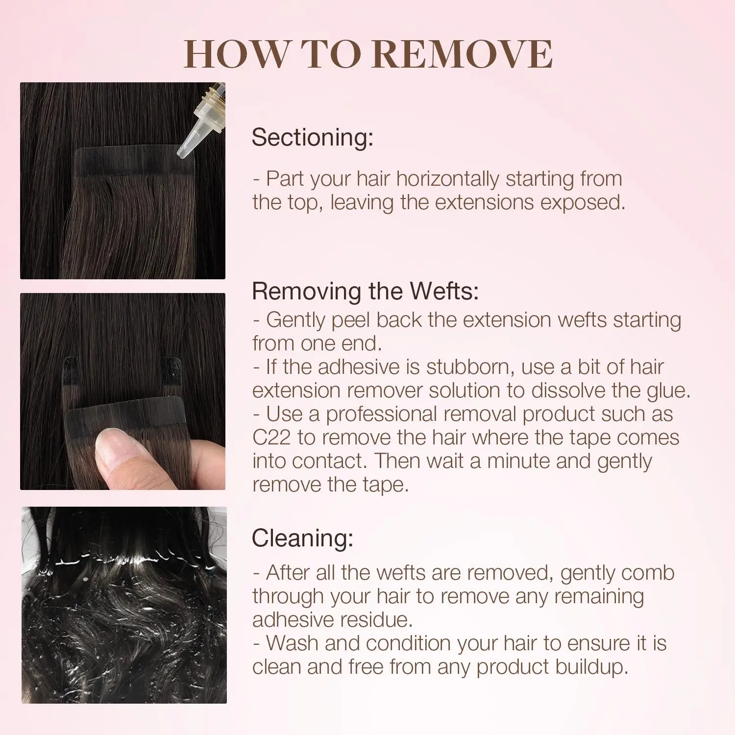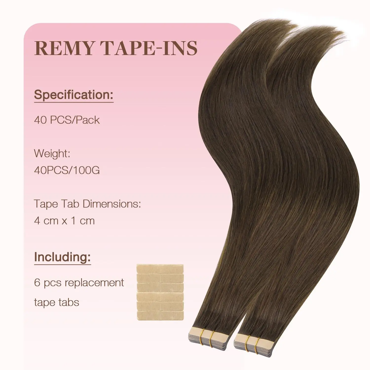 ·High-Strength Tapes & Easy to Take Out-- Specially developed high-strength invisible tape. You can refer to our product page to take out the tapes. Different Tape in hair extensions specification: 1.5inch width, 20 Pieces, 30g,40g,50g or 60g Per Package. 10-26inch available.