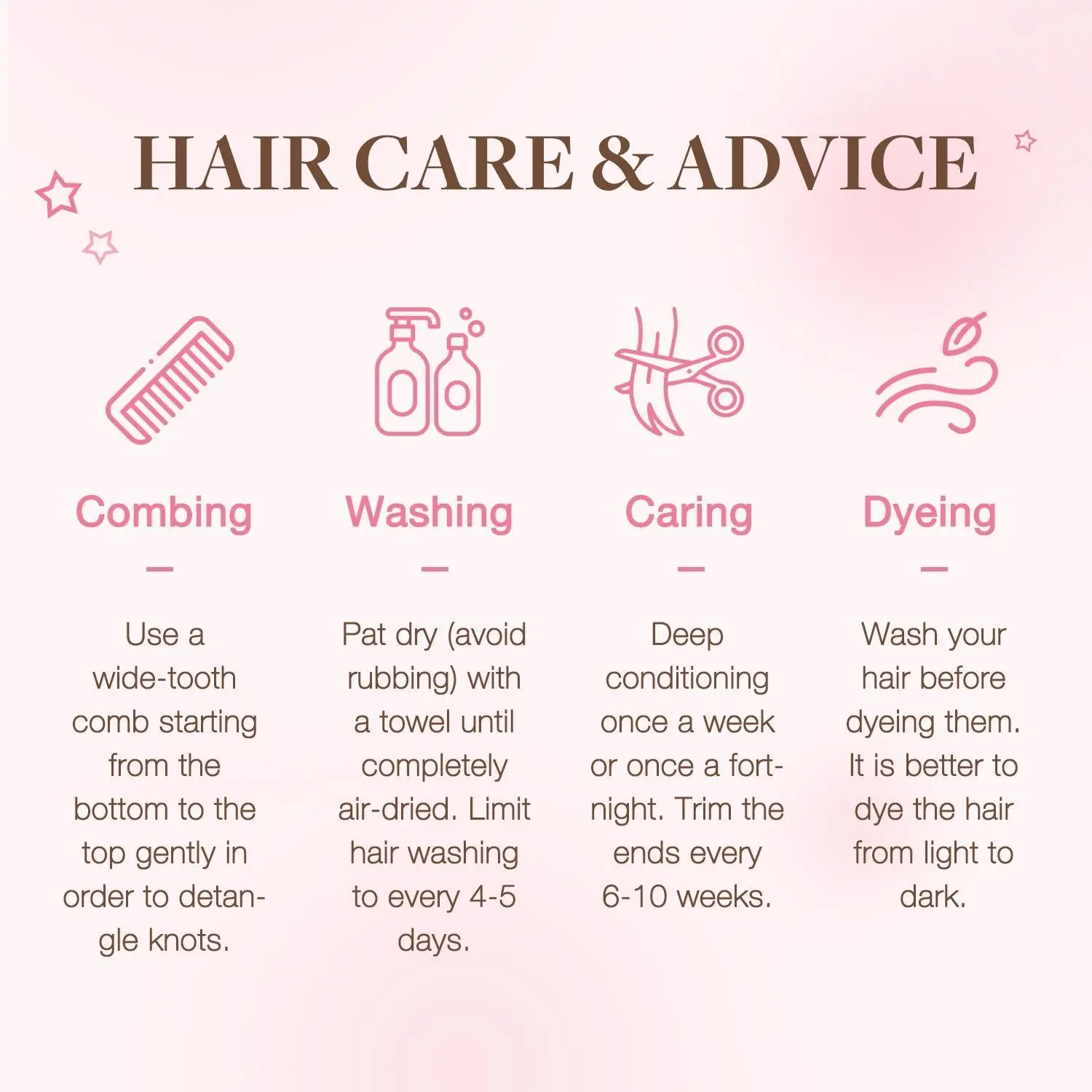 ·Quick Money-Back Guarantee-- Feel free to contact us if you have problems. Similar color with the real picture, may very slightly from colors shown due to lighting, monitors, and setting. You can choose the hair according the display picture, considering with your own root hair color. You can refer to the product page for installation and taking out, washing and care.