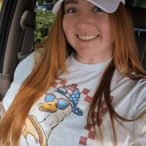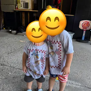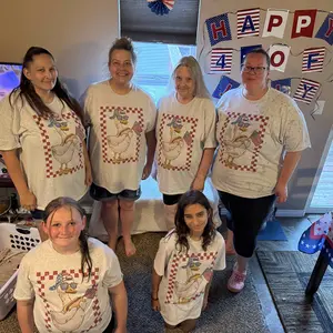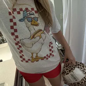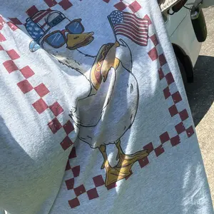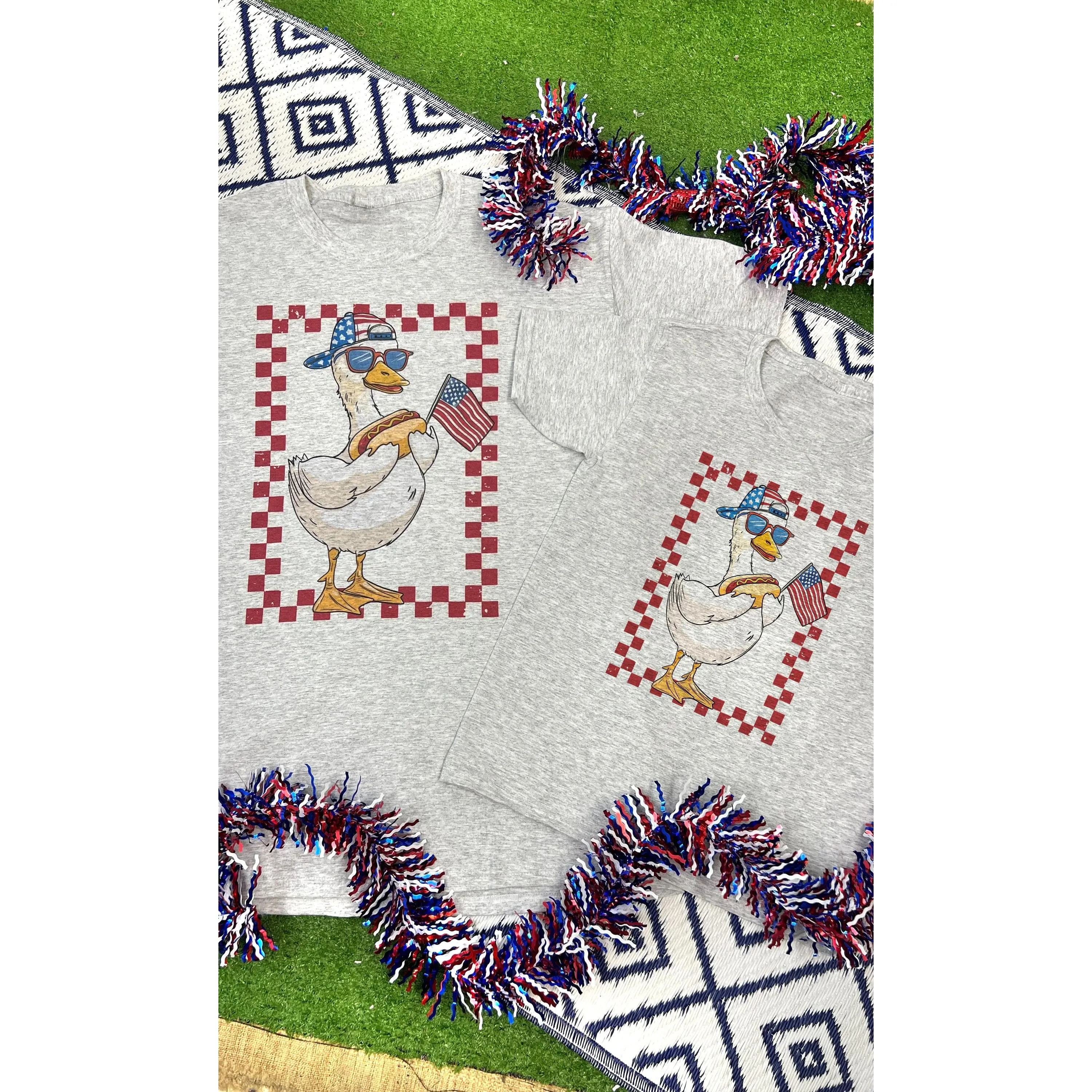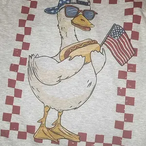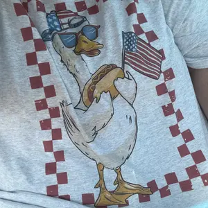 This 100% cotton ash grey tee features a playful design of a goose rocking sunglasses, a backward cap, holding a hot dog and American flag, framed in a bold red checker border.