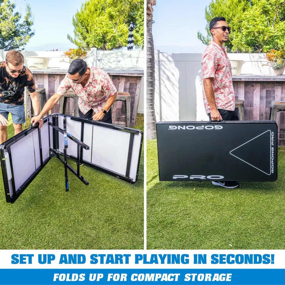 You asked for a taller, sturdier beer pong table that wouldn't break the bank and we listened. The GoPong PRO table elevates the playing surface from the traditional table height of 27.5'' (mid thigh height) to a more natural height of 36'' (waist height). The GoPong PRO tables also incorporate a thicker aluminum frame with center scissor legs, making them the most stable and durable tables available. Even with the bulked up features, we still designed the PRO tables to fold up for compact storage. If you are looking for a premium beer pong table at a reasonable price, the GoPong PRO is for you.