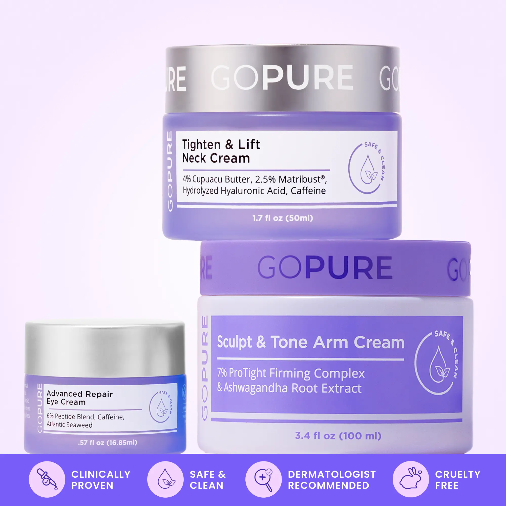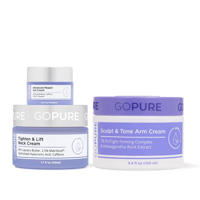 I'm loving the Go Pure Tighten Up Routine! This amazing trio has transformed my skin. The Eye Cream reduces fine lines and dark circles, the Knock Out Cream hydrates and plumps, and the Tone Arm Cream firms and tones. Together, they leave my skin looking smoother, brighter, and more radiant!