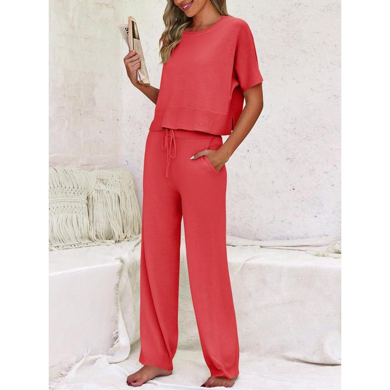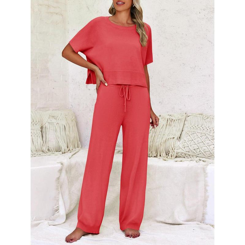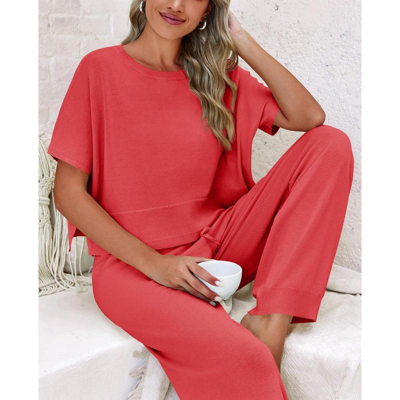 ·Knit short sleeve crop top with side slits and a trendy split design: The crop top in this set features a stylish split design, adding a unique and modern twist to your look. The short sleeves provide a flattering silhouette, perfect for showcasing your personal style.
