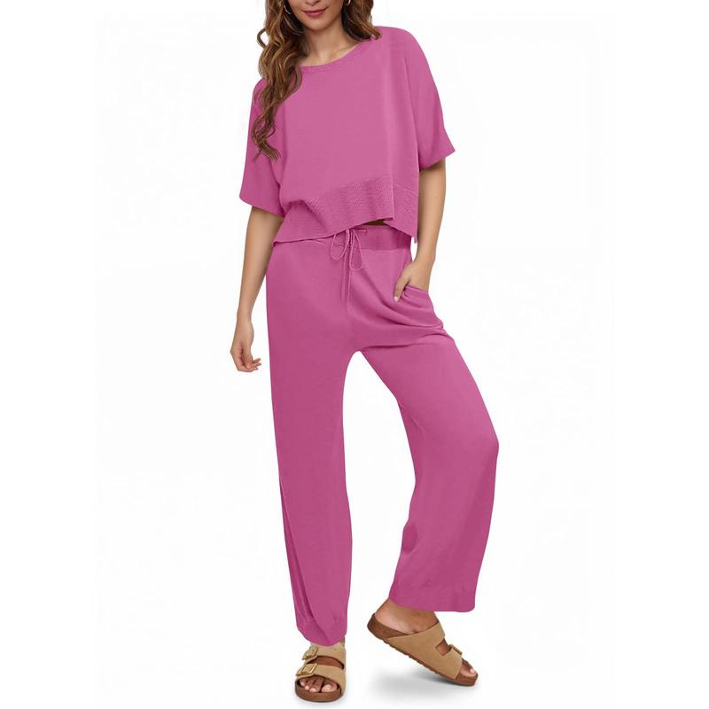 ·High waist wide leg pants with a drawstring for a customizable fit: The wide leg pants in this set are designed with a high waist and a drawstring, allowing you to adjust the fit according to your preference. The wide leg design provides a relaxed and comfortable feel, while still maintaining a fashionable look.