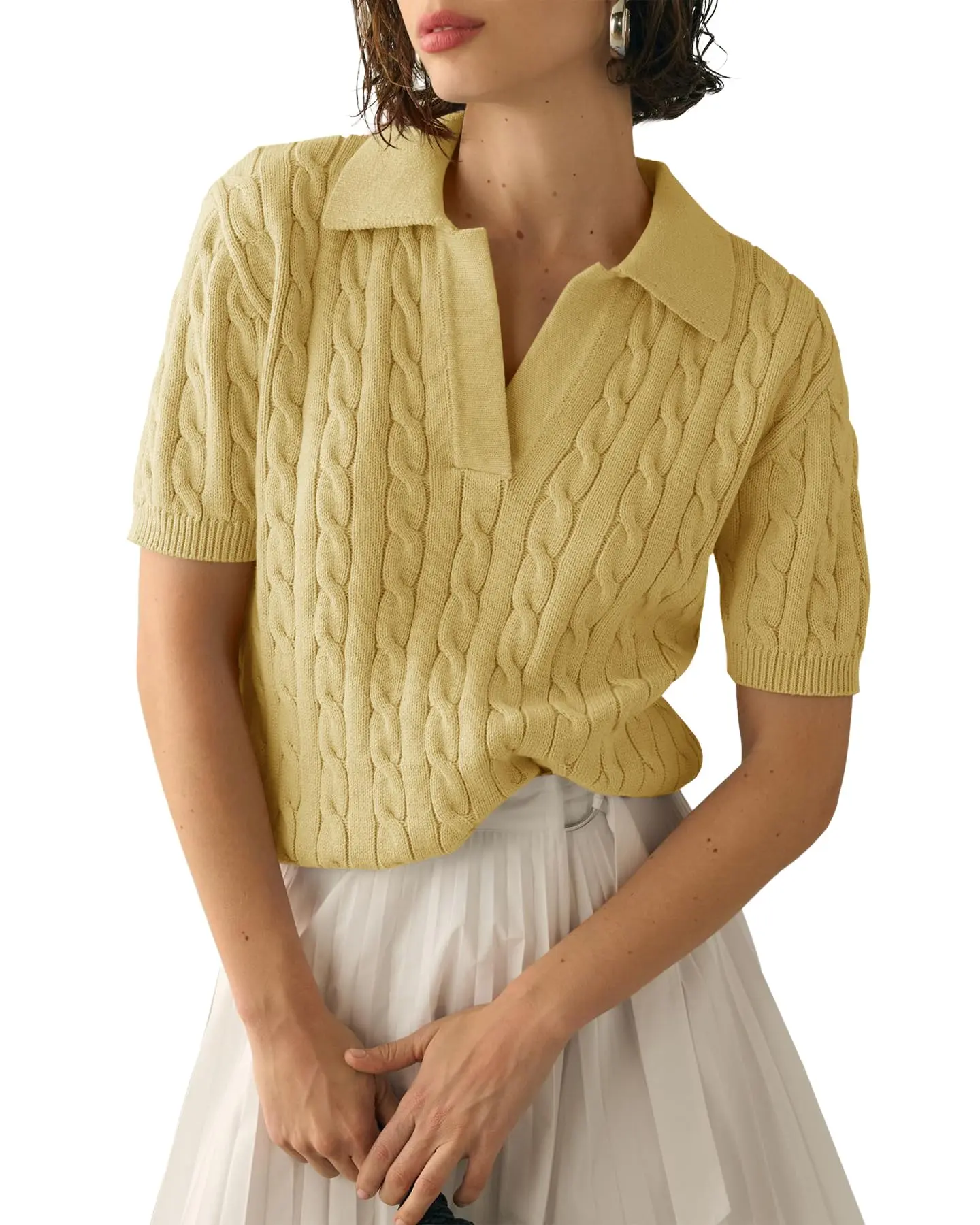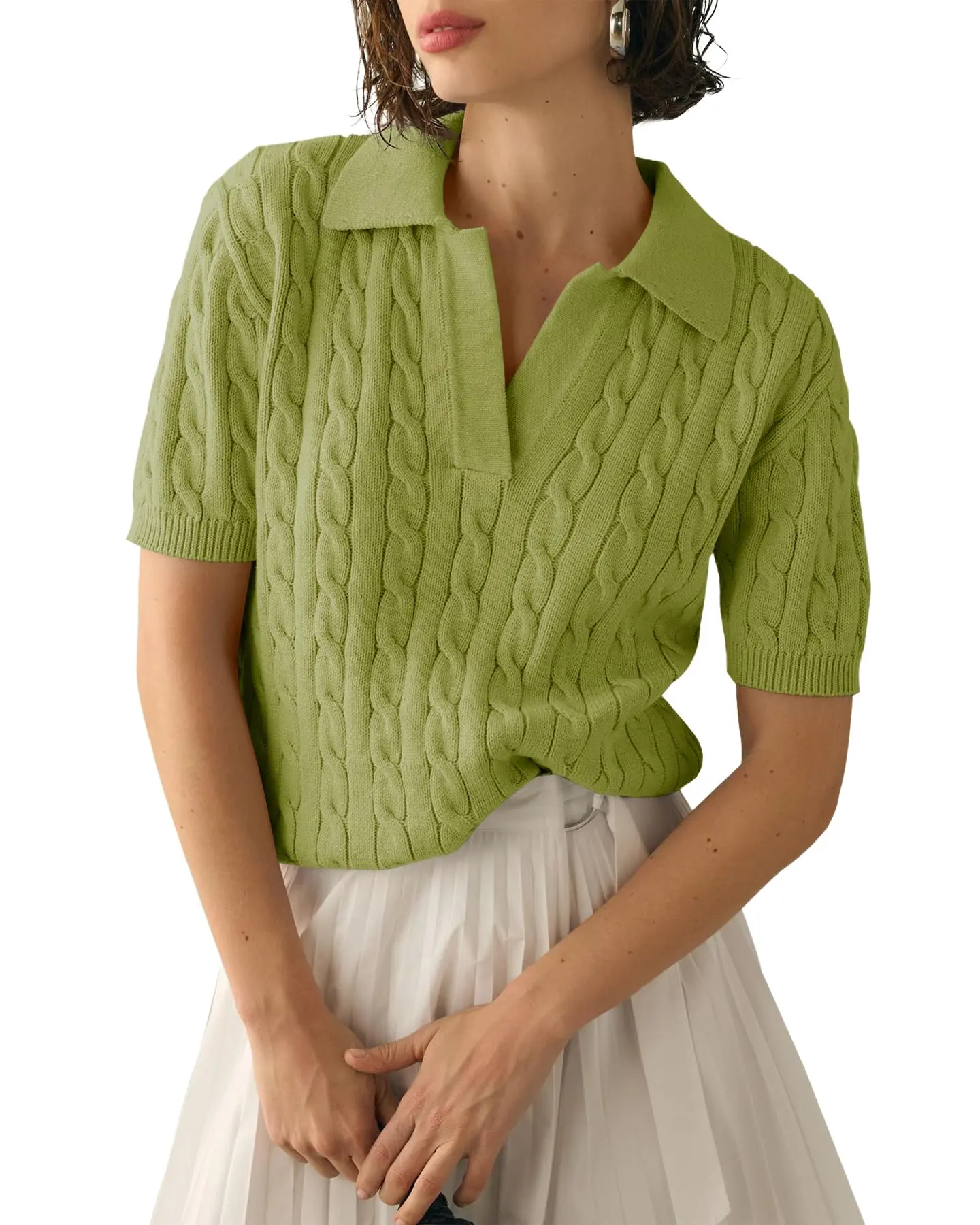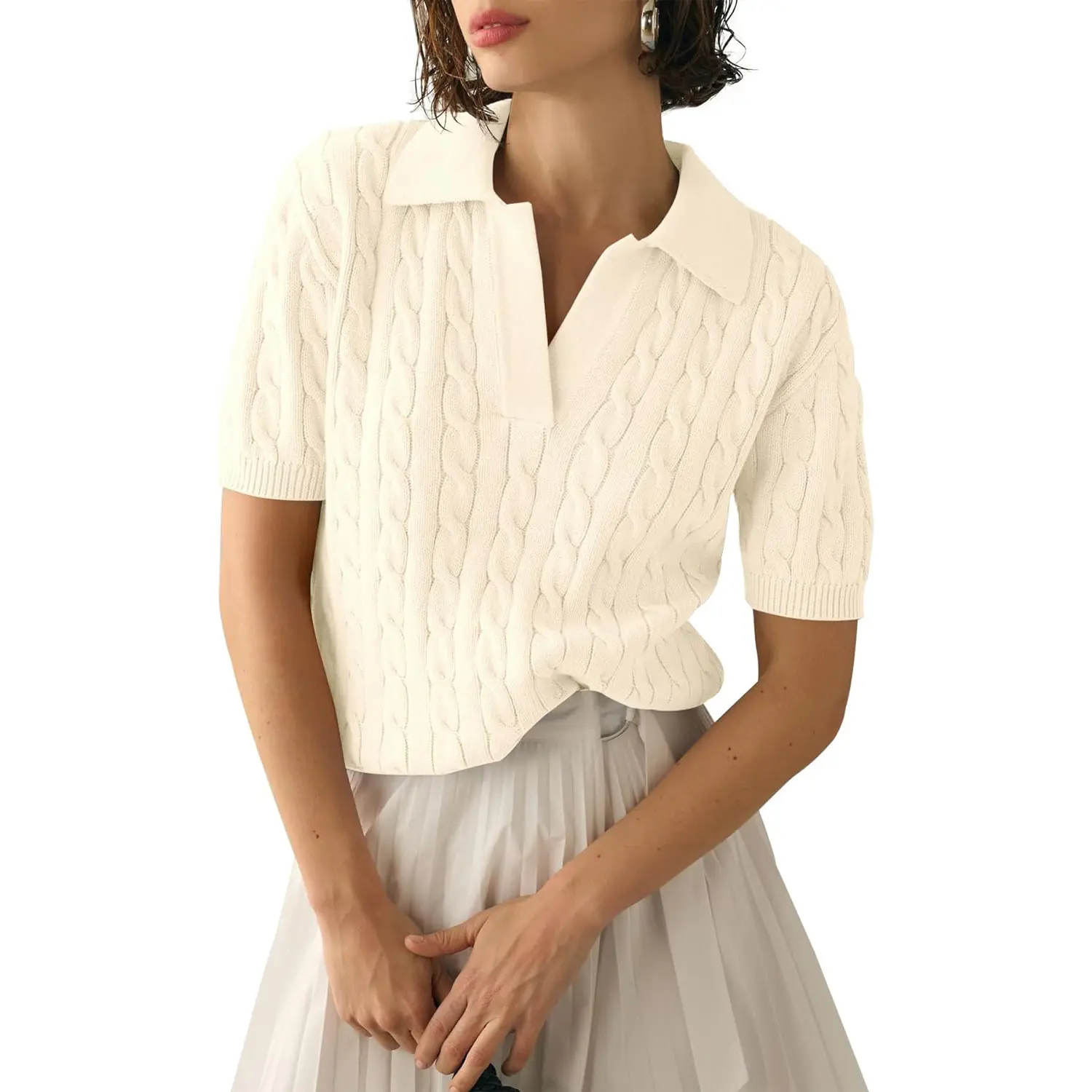 ·Features: Women's Cable Shirt, Short Sleeves, Slim V Neck, Small Lapels, Elasticized Ribbed Cuffs and Hem, Knit, Basic Solid Color, Loose Fit, Casual Style. Comfortable women's soft summer top.