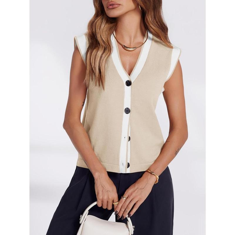 ·Features - Womens cap sleeve tank tops, deep v neck, button down, elegant knit vest tops for women, loose fit, summer lightweight pullover sweaters with contrast trim