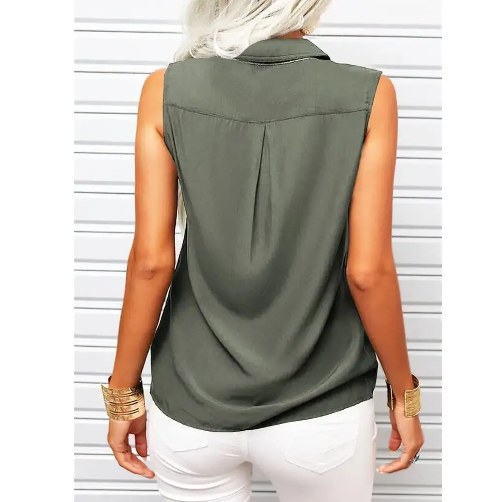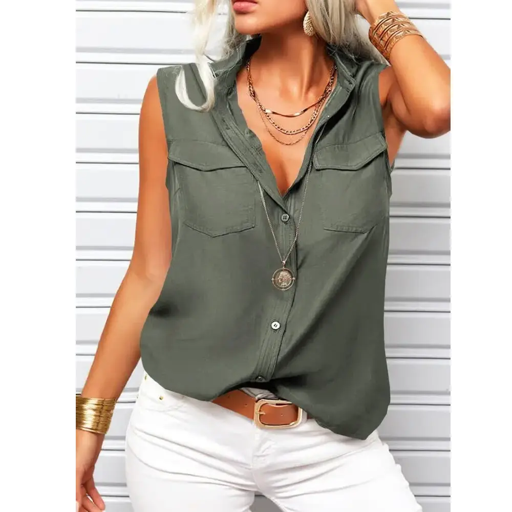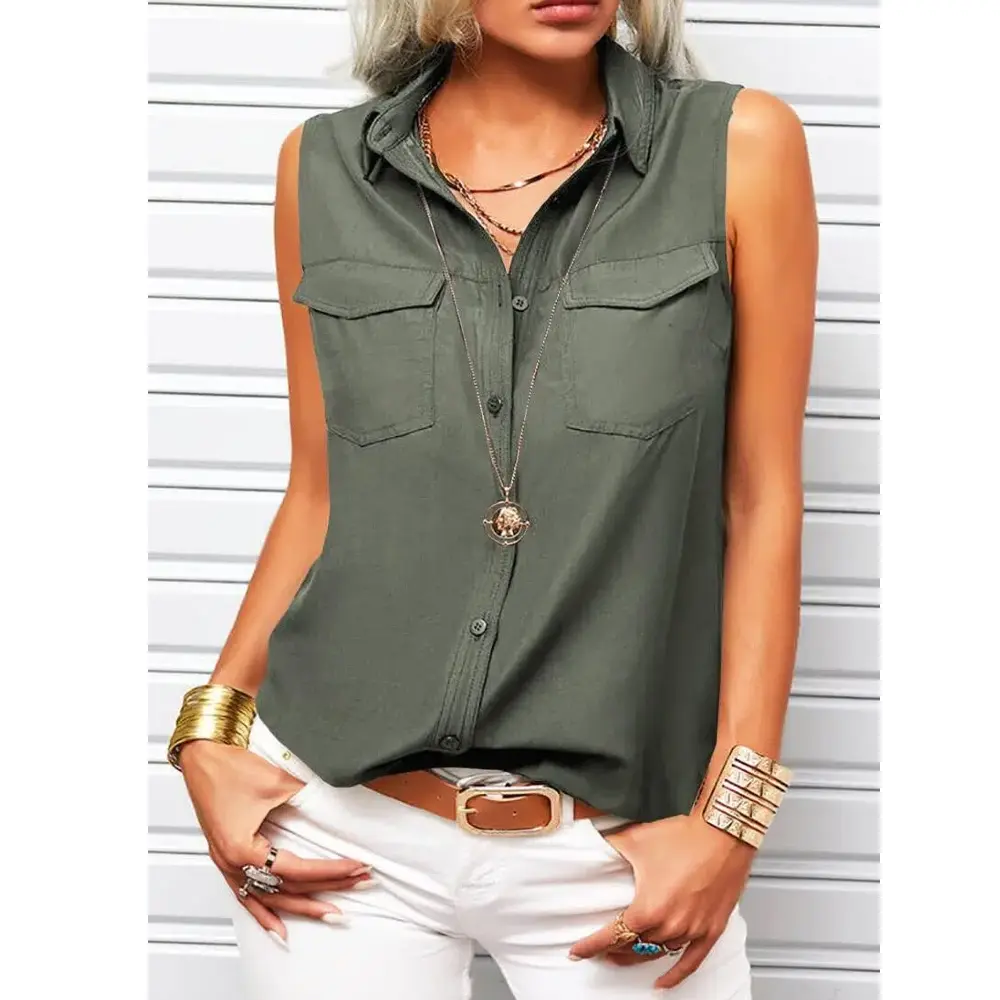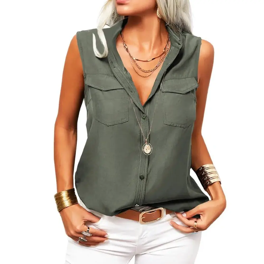·Feature:Lapel Neck,Button Down,Sleeveless,Pockets,Regular Fit,Casual.