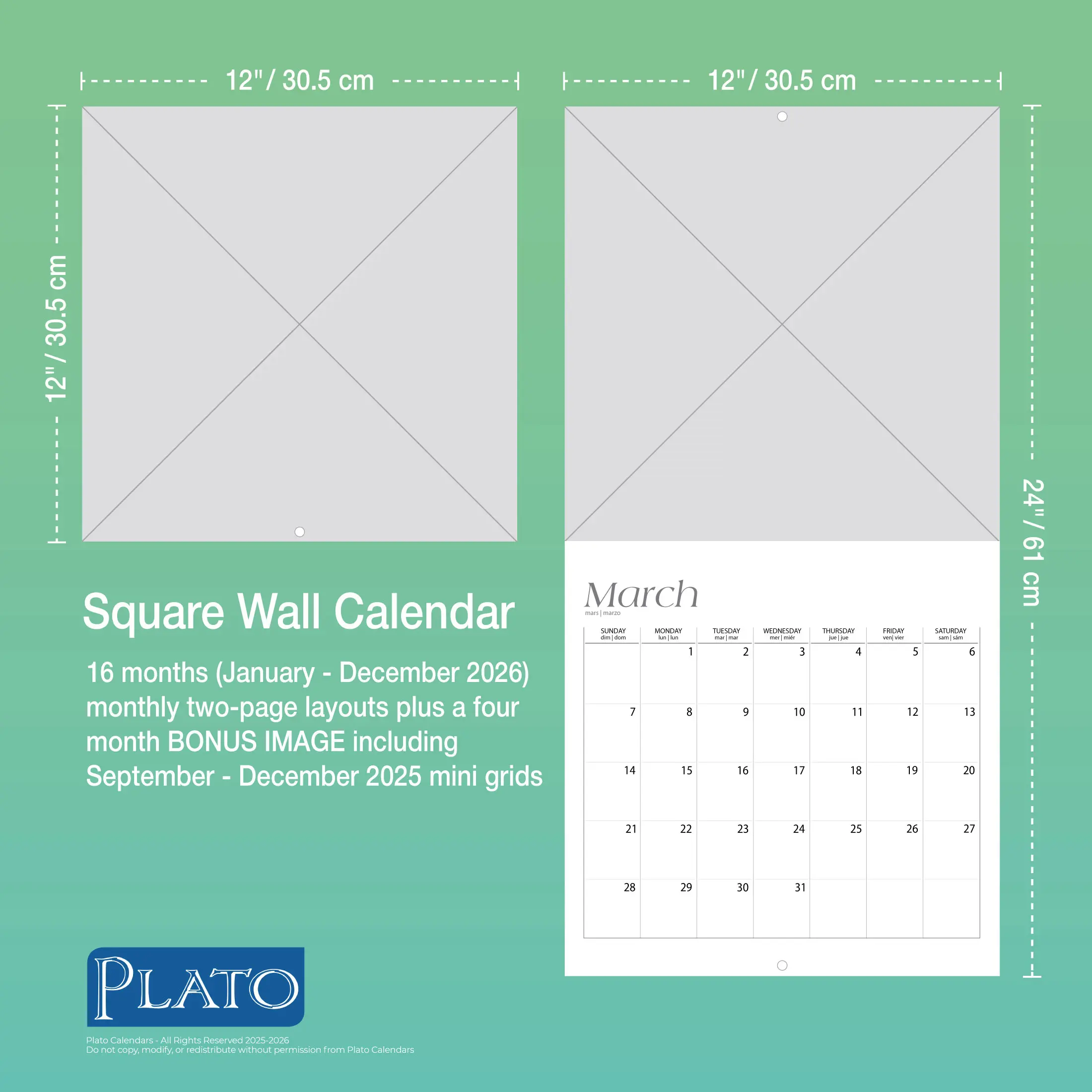This classic square wall calendar is the ideal way to bring stunning photos and designs into your home–or as a gift for friends and family. The 12" x 12" calendar opens to a tall 24 inches to grace your wall with stunning images of your favorite subject. Dated January to December, it also includes a bonus image accompanying a four-month preview page of September to December of the previous year to give you a jump start on planning.