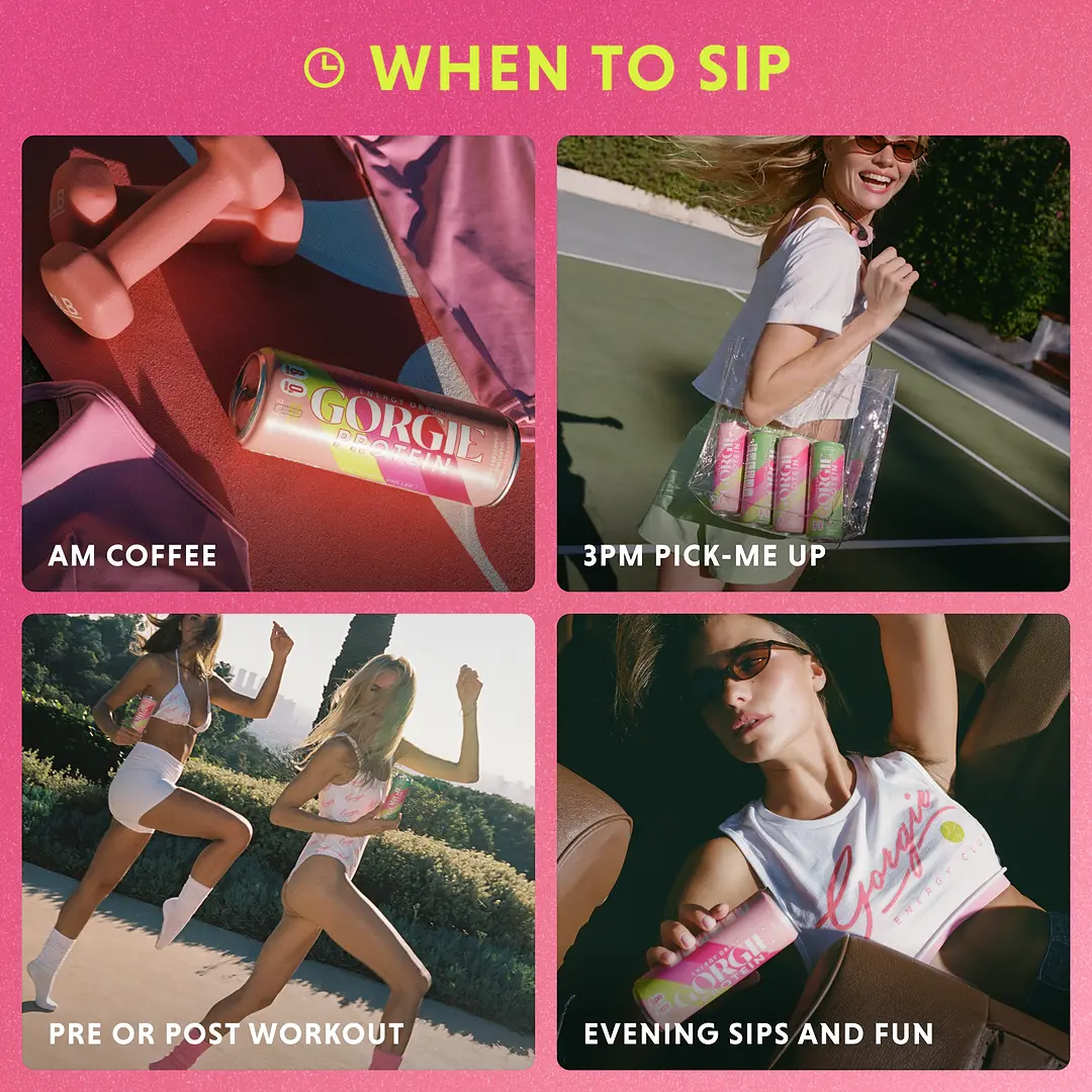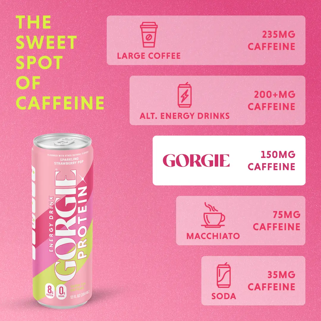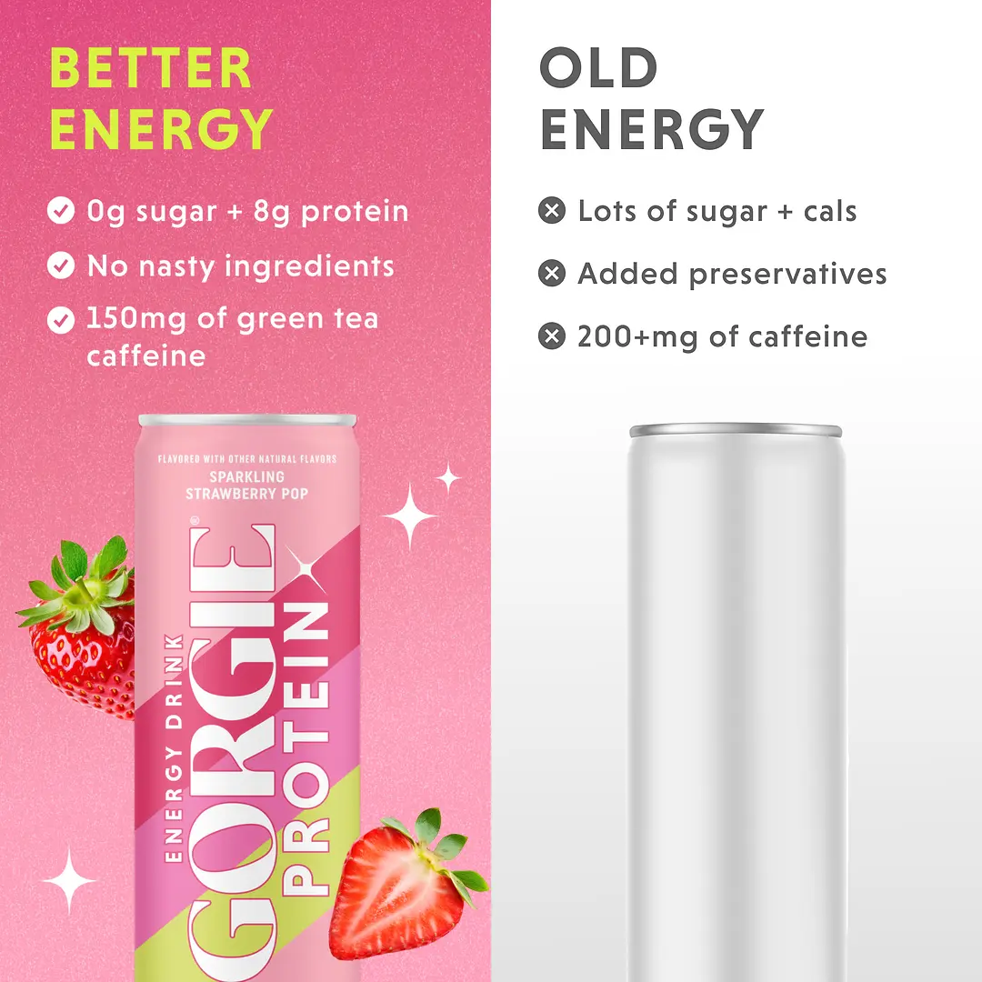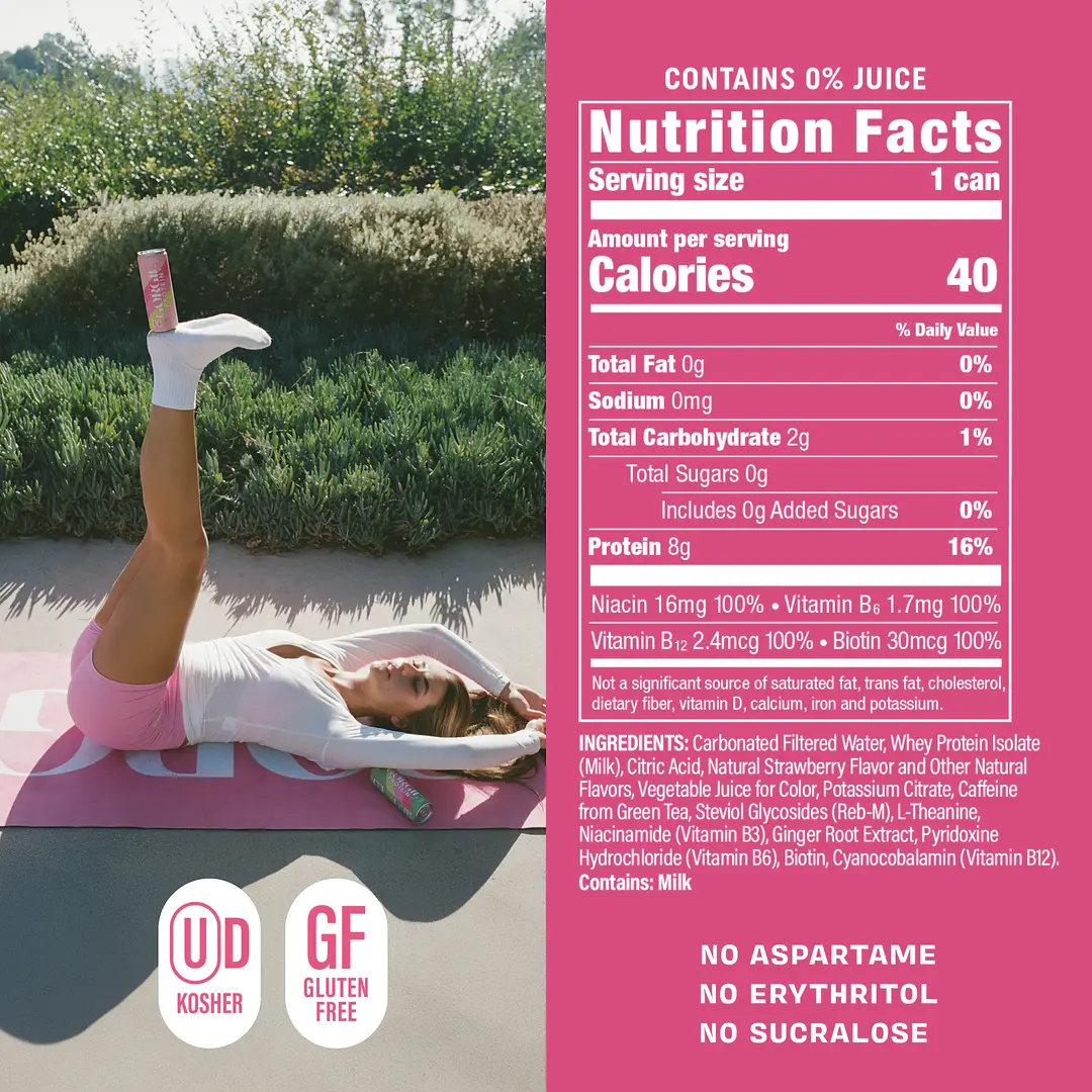 energy, upgraded.Energy meets protein, a sparkling energy drink that does more. with 8g of protein, 150mg green tea caffeine, and 0g sugar, it delivers smooth, feel-good energy without the crash. light, refreshing, and actually cute enough to carry with you.designed for mornings, workouts, mid-day pick-me-ups, and everything after. powered by green tea caffeine, l-theanine, and b vitamins — no aspartame, no sucralose, no erythritol.finally, an energy drink that tastes good, feels good, and fits your routine.why you’ll love it8g protein150mg green tea caffeine0g sugarsmooth energy, no jittersno artificial sweetenerssparkling + refreshingenergy that works — and looks — like you. ✨