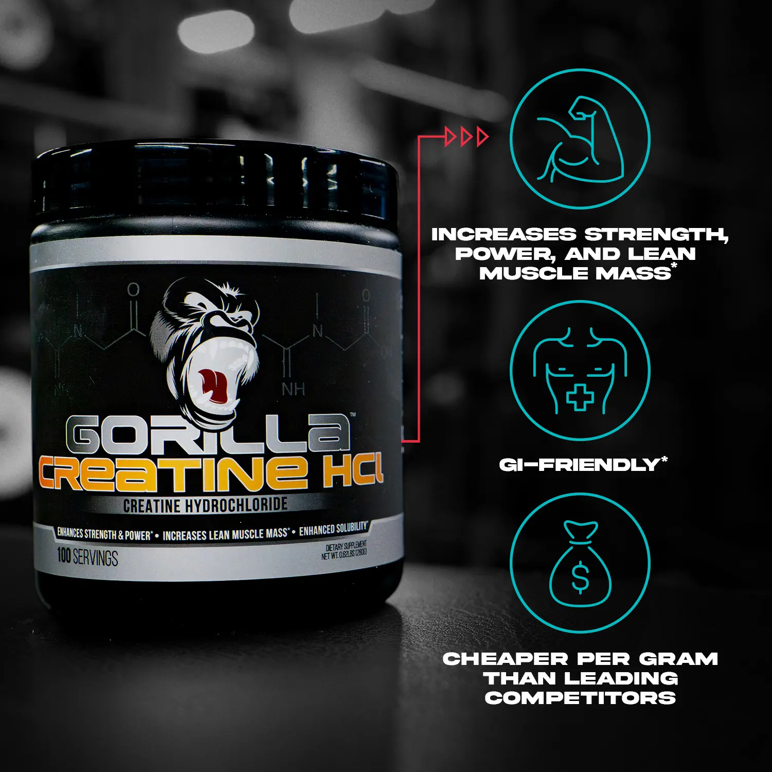 To optimize absorption and improve taste, mix it with Gorilla Hydration. The added electrolytes help shuttle creatine into muscle cells more efficiently while also enhancing the flavor of HCl, which isn’t as tasteless as monohydrate [R].