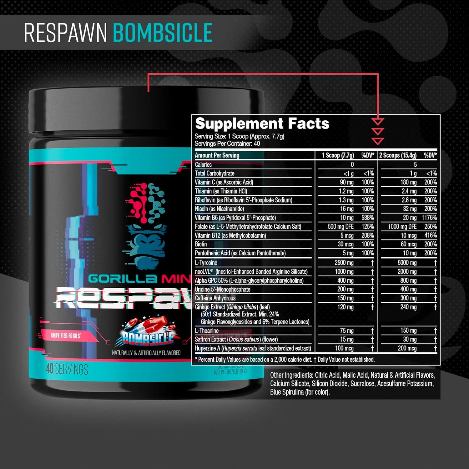 Per max dose, Gorilla Mind Respawn features 5000 mg of L-Tyrosine, 2000 mg of nooLVLĀ®, 800 mg of Alpha-GPC 50%, 400 mg of Uridine Monophosphate, 300 mg of Caffeine, 240 mg of Ginkgo Extract, 150 mg of L-Theanine, 30 mg of Saffron Extract, 400 mcg of Huperzine A, and a blend of 9 essential vitamins in their biologically active formats.