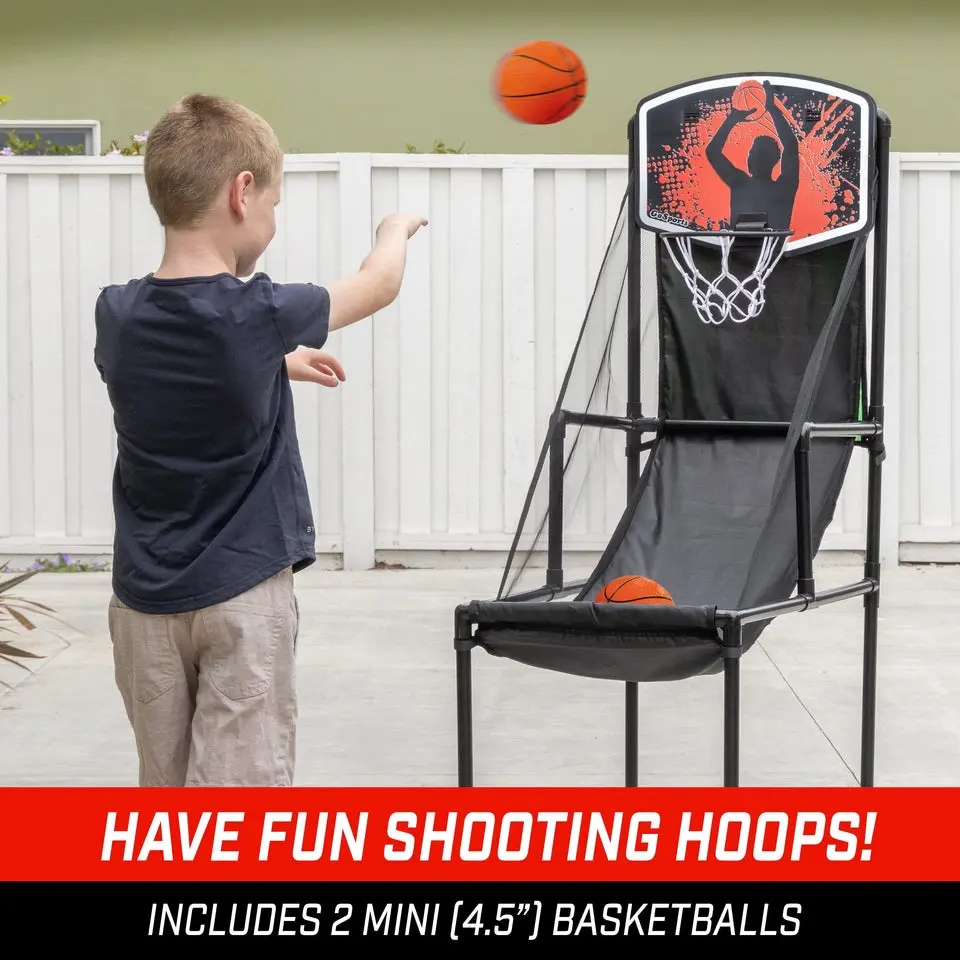 Get double the fun with GoSports 2 in 1 Basketball & Football Arcade Game! Our new innovative design allows switching between shooting hoops and throwing passes to keep kids entertained for hours without breaking the bank. The set includes a basketball hoop and football toss target with a frame and ball catch pocket, 2 mini basketballs (4.5 inches), 2 footballs (6 inches), & pump. Set up indoors or outdoors for active play, quality parent-child time, bonding with grandkids & more. When switching games, the hoop conveniently hangs on the side of the frame, while the football game remains hidden behind. We include step-by-step, clearly written instructions with illustrations for zero-hassle assembly. Made from premium PVC with a secure interlocked joint design, this arcade game makes a perfect gift for withstanding hyperactive boys and girls aged 3 to 10. Assembled frame measures 36 L x 19 W x 55 H inches. Upgrade playtime with GoSports 2 in 1 Basketball & Football Arcade Game!
