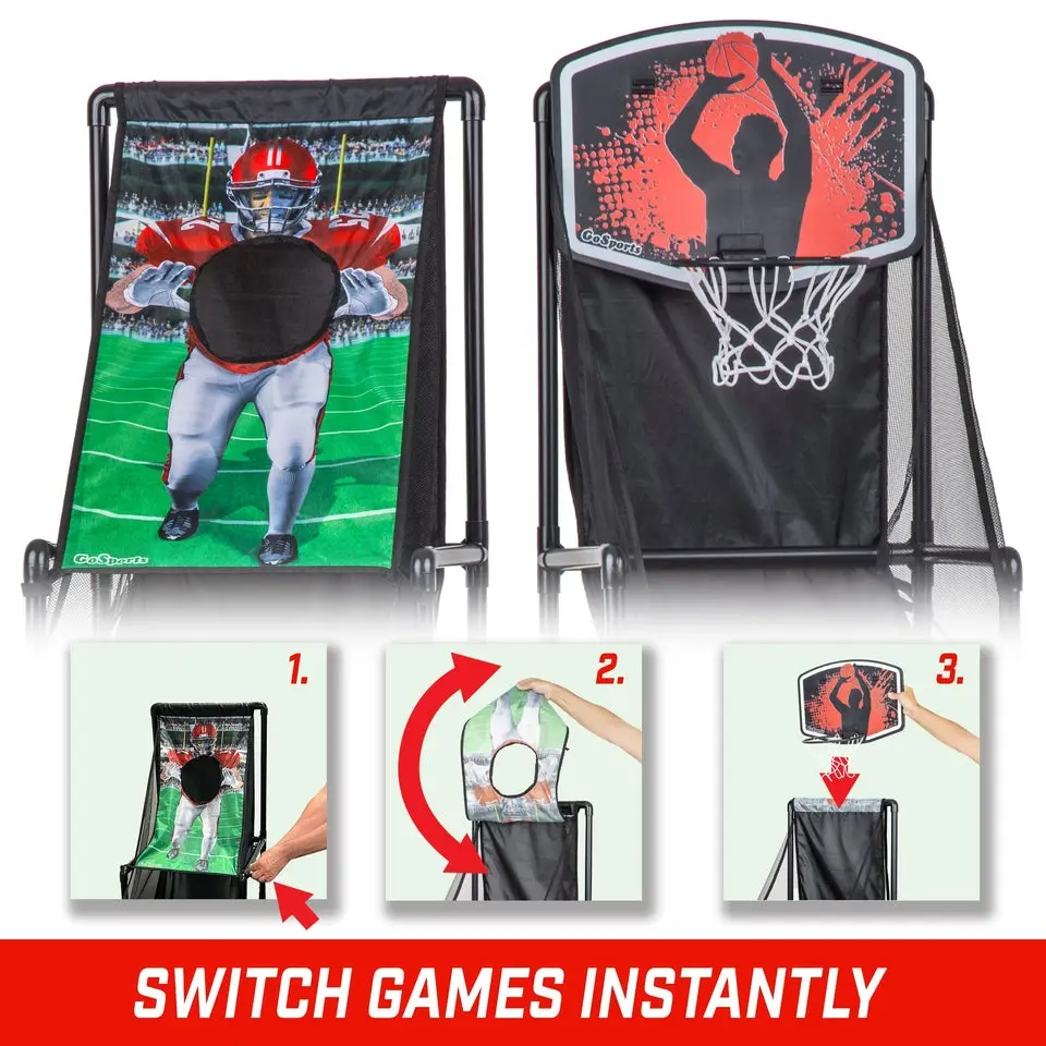 ·2 IN 1 ARCADE GAME: Innovative design features basketball & football arcade games for 2x the fun; Instantly switch between shooting hoops or throwing passes to keep kids entertained without breaking the bank