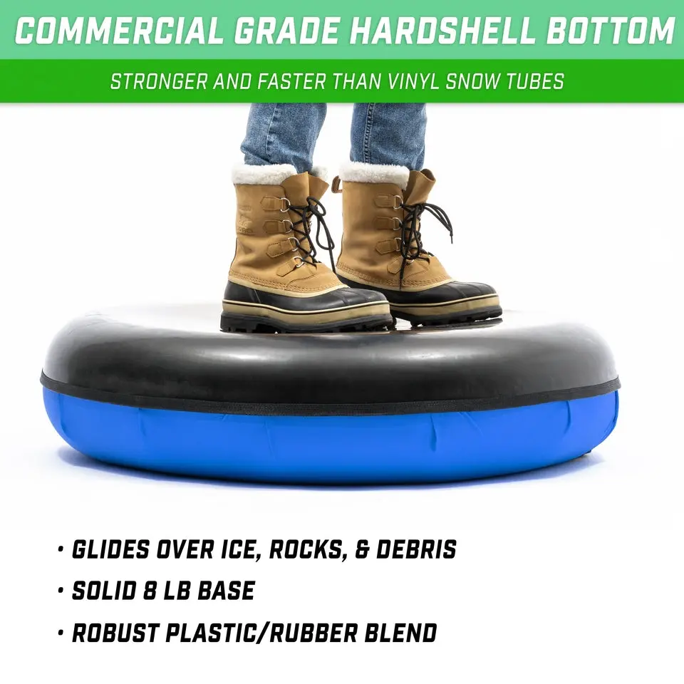 Enhance your sledding experience with GoSports 40 in Hard Bottom Snow Tube! Our snow tube features a reinforced DuraTube with a firm puncture resistant base made to be both fun and functional. Can't find a steep enough sledding hill? The ultra slick bottom lets you glide down hills at faster speeds than your average snow tube and makes towing a breeze! Plus, the double stitched blue canvas cover has built-in grip handles that allow you to ride with confidence, so you can remain firmly seated the entire time! Once you've reached the bottom, effortlessly pull the snow tube back uphill using the front tow strap for hours of fun. Relax and enjoy the ride with our no poke inflation valve that works with any standard tire pump and stays out of your way while riding for maximum comfort. We've also included our patent pending rapid deflation tool, so you can quickly deflate and store the tube at the end of the season. Start the winter off right with GoSports 40 in Hard Bottom Snow Tube!