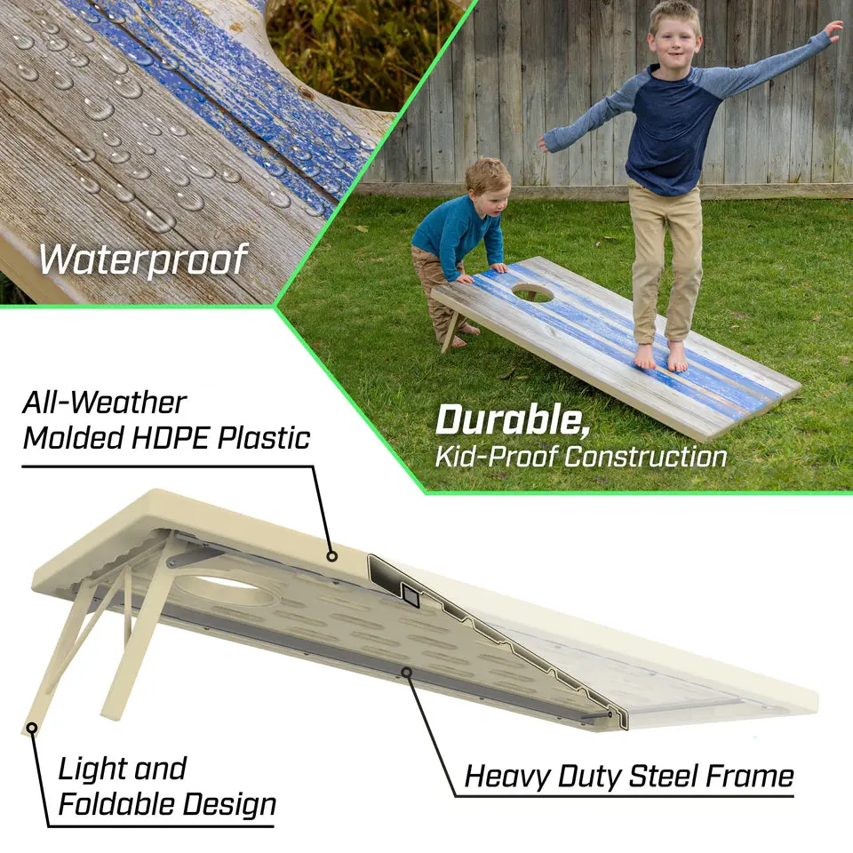 ·PREMIUM ALL-WEATHER CORNHOLE BOARDS: UV printed with realistic wood graphics, our ToughToss cornhole boards can withstand humidity and rain showers, unlike traditional wood sets; Boards are made from robust weatherproof materials so you can play all year round