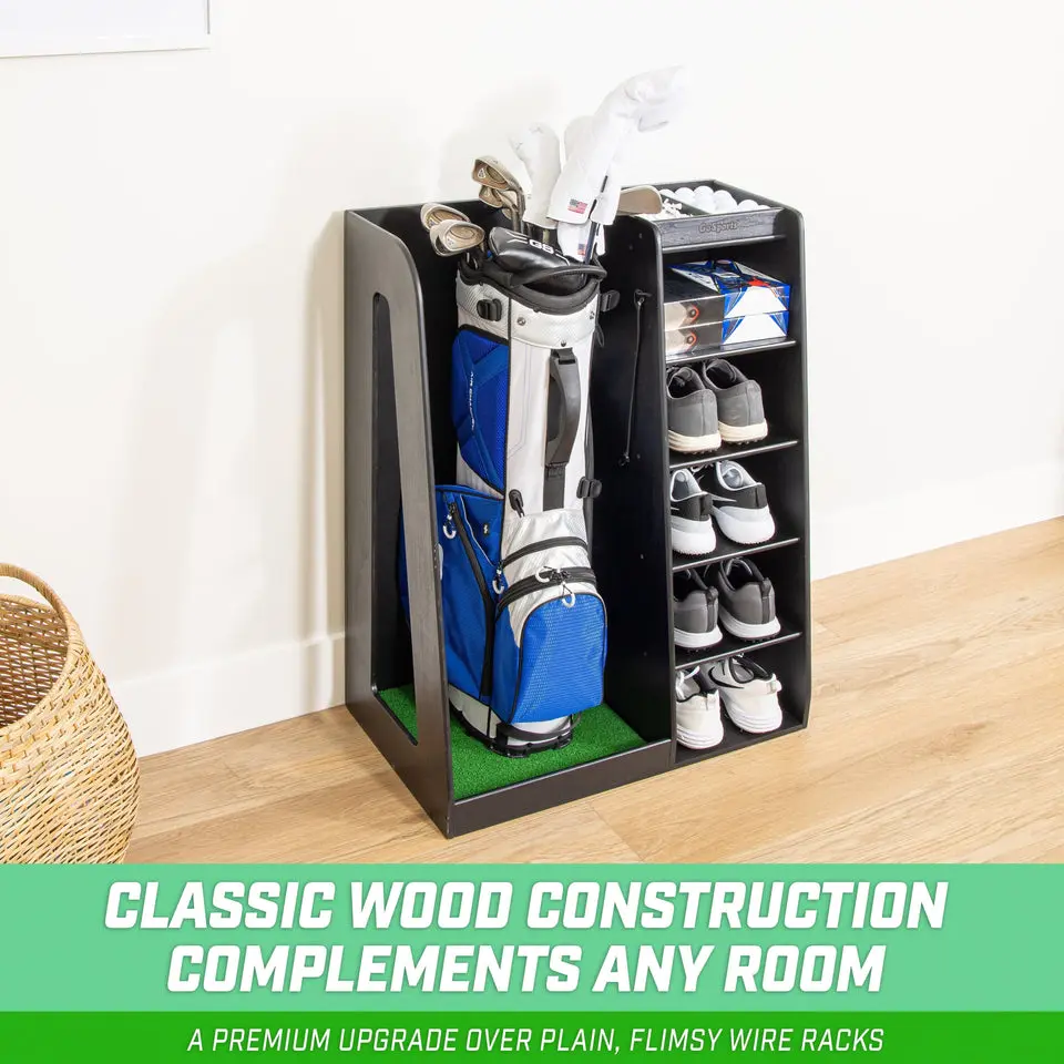 Keep your golf equipment and accessories looking neat and professional! The GoSports Premium Wooden Golf Organizer is a stylish space-saving solution for neatly storing golf equipment while keeping it on hand. The premium build features sturdy wood construction and is painted black for a clean look that complements any home, office, garage and more. Don't settle for flimsy metal wire storage racks! Upgrade with multiple heavy-duty storage compartments (golf bag compartment, 5 shelves) with enough space to store virtually of your equipment. Rounded edges protect your equipment from snagging, scratching and tears. The organizer includes illustrated step-by-step instructions for easy assembly; assembled size measures 17 L x 29 W x 37 H inches. The golf bag compartment measures 16 L x 16 W x 36 H inches. The shelves measure 11 W x 6.5 H and range from 11 inches deep to 16 inches deep. Store and display your golf equipment with pride with the GoSports Premium Wooden Golf Organizer!