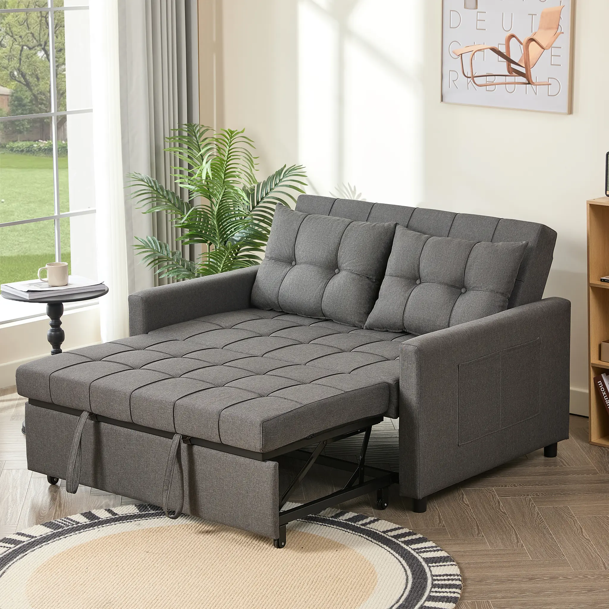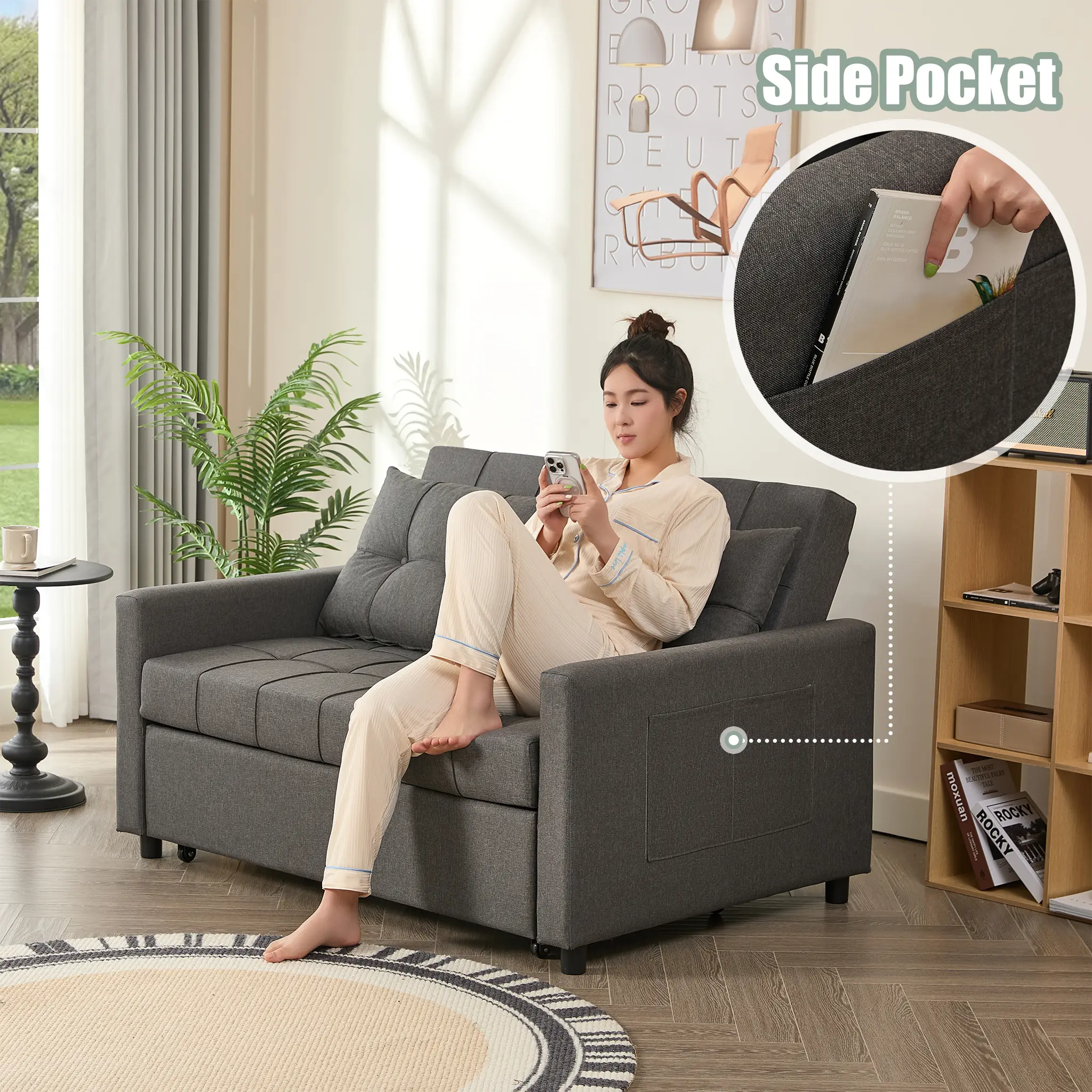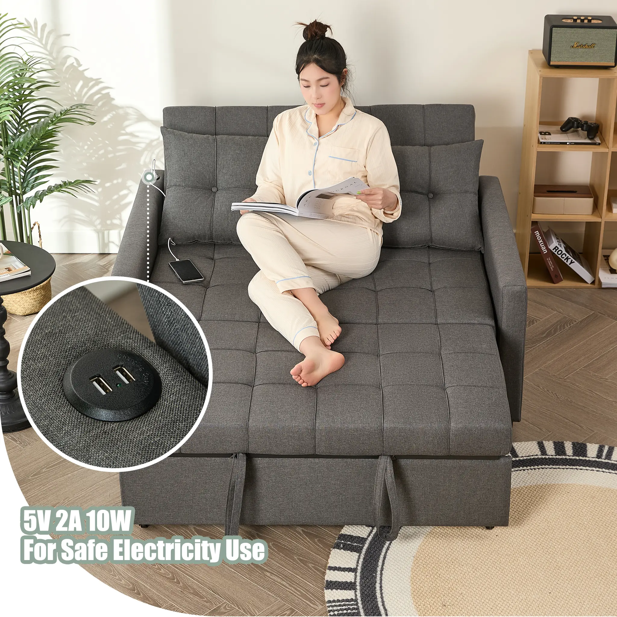 ·Premium Material: This Convertible Sofa Bed is built with a sturdy steel frame, providing exceptional support and long-lasting durability. And it has undergone rigorous testing before leaving the factory—its key components are proven to withstand over 10,000 uses. Equipped with USB ports on the side (5V/2A, 10W), this sleeper sofa allows for safe and reliable device charging, making it perfect for everyday use.