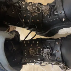 3 1/4" (83mm) Flared Platform Lace-Up Ankle Boot Featuring Double Skull Buckle Strap Shield & Skull Buckle Strap Across the Toe, Spike Studs, Skull Knocker w/ hanging Charms & Hanging Chain Details