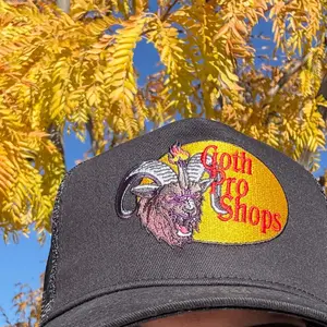 Welcome to the Goth Pro Shop🎣💀 Our ‘Goth Pro Shops’ - Trucker Hat is finally back in stock. Grab one before they sell out again! #blackcraft #hat #goth  A classic black trucker hat with an adjustable snap that ensures a comfortable fit. With a cotton sweatband, a pre-curved bill, and finished with a plastic snap closure. Featuring a Goth Pro Shops patch across the front.  Fabric: 50% Cotton, 50% Nylon Mesh back Adjustable plastic snap One size fits most