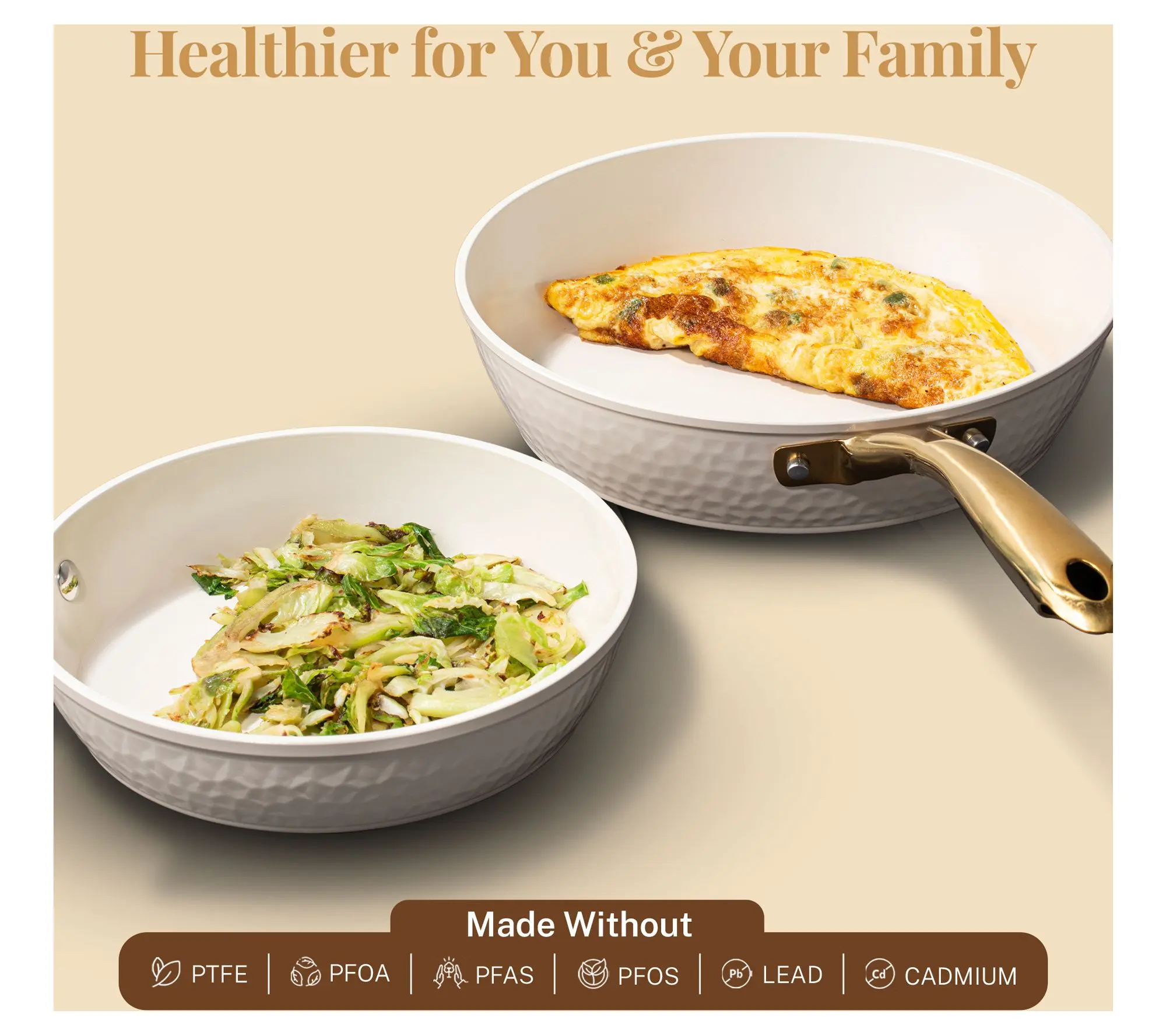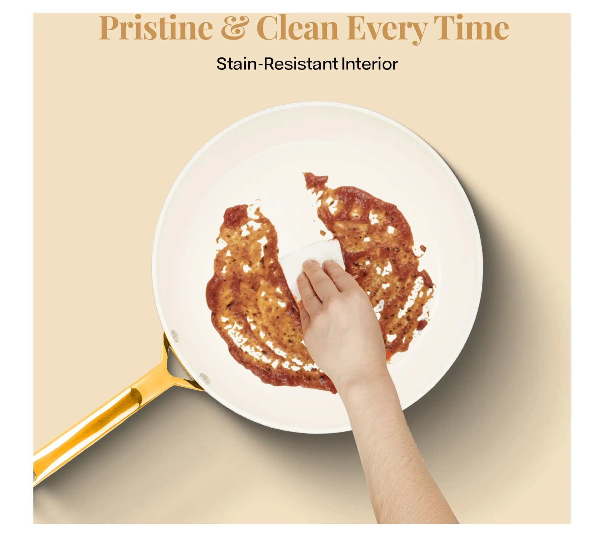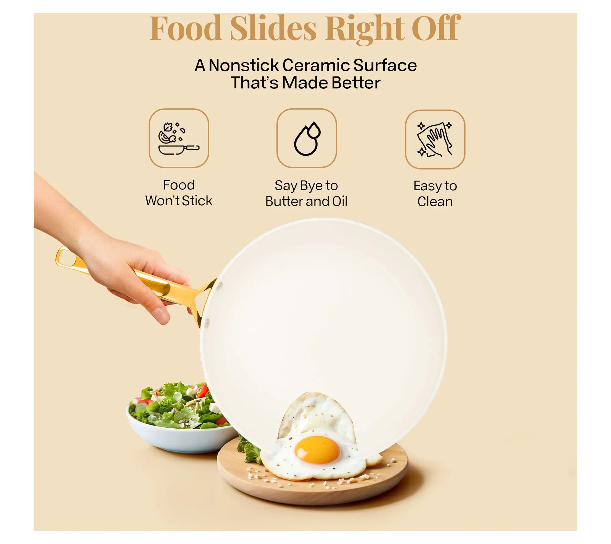 Step into a world of culinary possibilities with this ceramic cookware set, designed for versatility and performance. Gather your loved ones for a weekend brunch or cook up a comforting dinner with ease -- each piece is crafted for effortless food release and a hassle-free experience. Whether you're simmering soups or frying up your favorite dish, you'll enjoy consistent quality and nonstick convenience. From Gotham Steel.