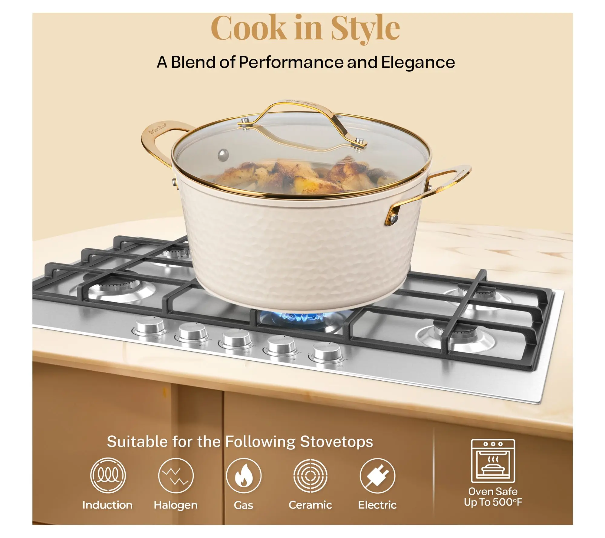 #Complete Cookware Set: This Hammered design kitchen cookware set includes everything you need to start your cooking at home while providing the perfect combination of style and effectiveness. The set comes with an 8" frying pan, 10" frying pan with lid, 1.5 Qt sauce pan with lid, 2.5 Qt sauce pan with lid, 5 Qt stock pot with lid, and a stainless steel steamer. • Ultra-Nonstick: Get healthier food, easy food release, and quick cleanup with Gotham Steel's award winning ceramic nonstick coating- Each piece of cookware and bakeware is generously coated 3x with nonstick coating ensuring foods and sticky sauces don't stick while using, without any butters or oils need, for years#banita#tiktikshop