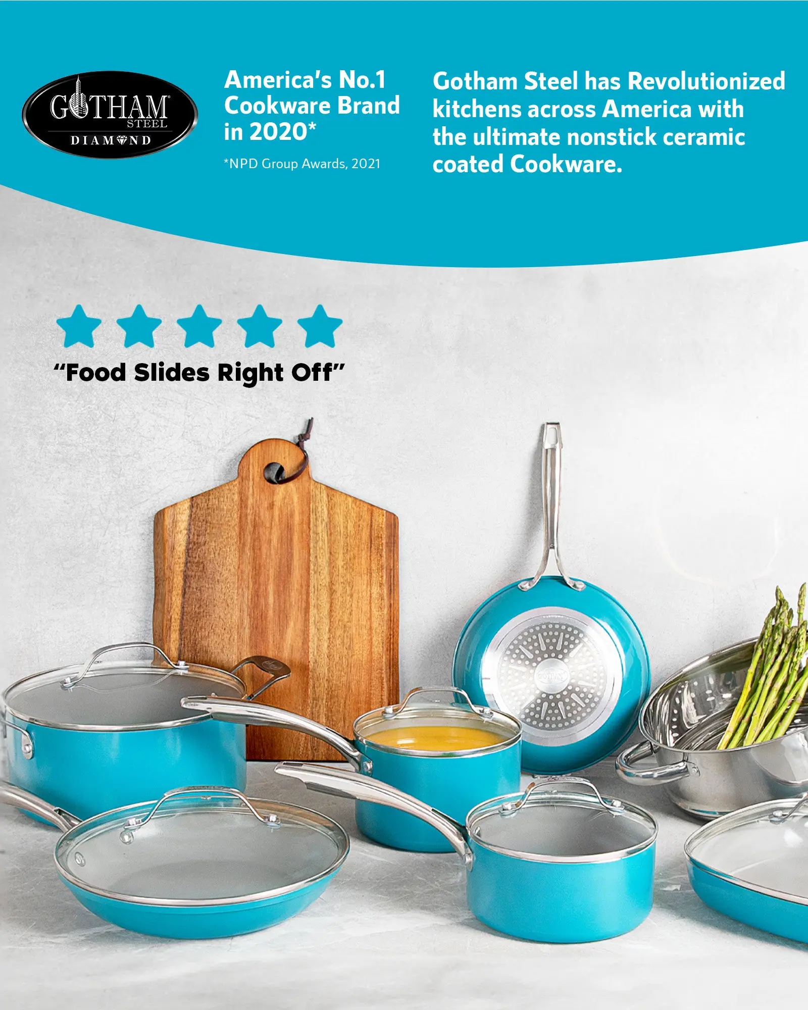 Gotham Steel Cookware Set was designed with a Ti-Cerama coating that combines super strong titanium fused with super slick ceramic for the perfect balance of nonstick and durability. It is PTFE and PFOA free which means nothing will stick. Cook without butter or oil.